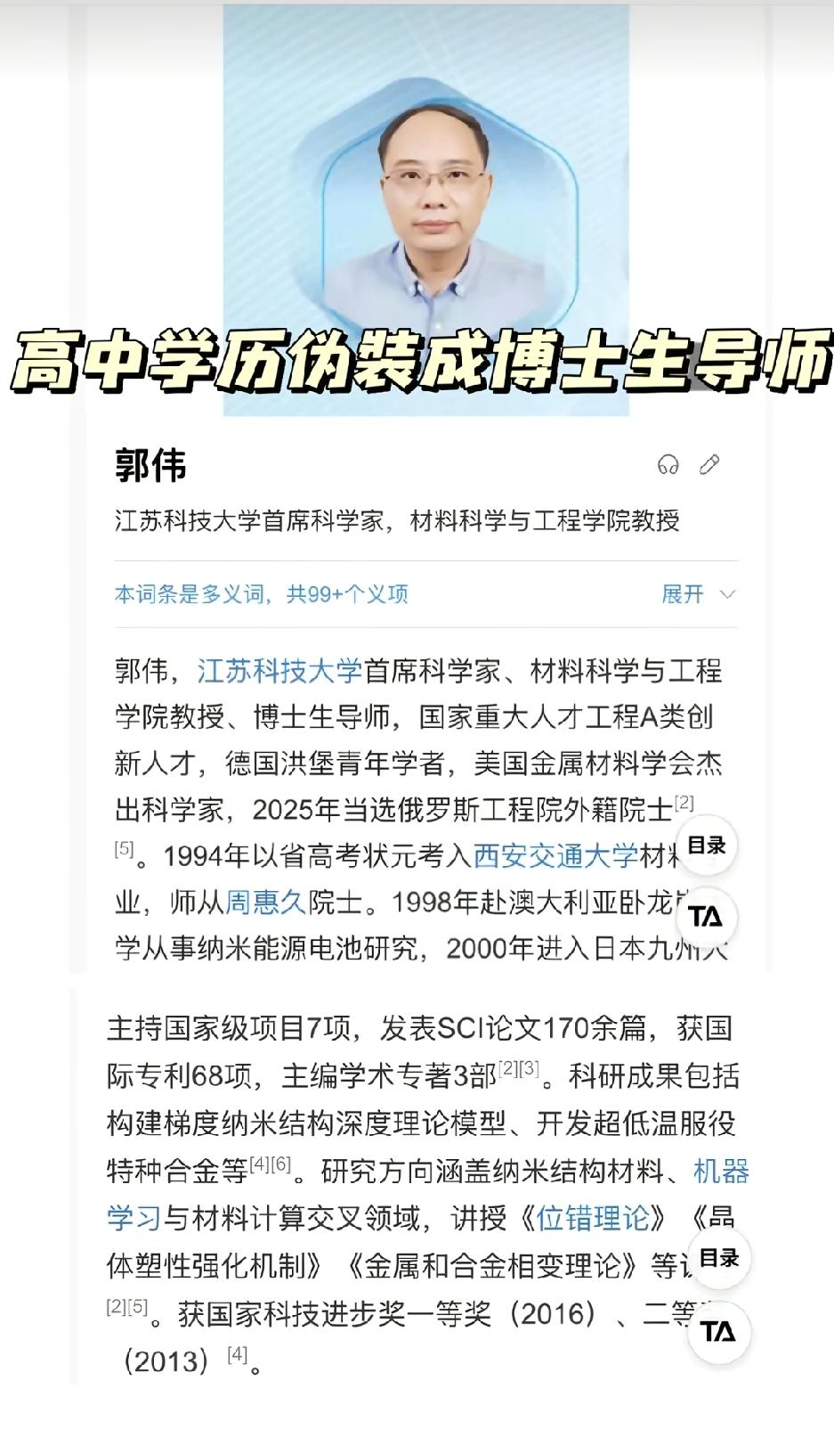 江苏科技大学的首席科学家郭某被发现学术造假,简历造假,当年的高考状元假,国际荣誉假的,权威论文假的。 弄个首席科学家一路都是造假过来的,怎么在这个时代还如此的造假?网上一查就不就知道了吗?更主要的是,在这个时代如此造假还能通过,光明正大的成了江苏科技大学的首席科学家,不可思议,荒诞至极!对学生怎么交代?占用的科研经费怎么算?