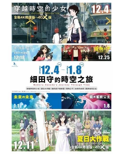 MCL戏院🌀 「細田守的時空之旅」六部經典作品載譽回歸大銀幕🎬✨  🎟️ 有關場次將於 11月24日(星期一)中午12時開售    📽️ 「細田守的時空之旅」重映日程:⏳《穿越時空的少女》|12月4日 – 10日🎴《夏日大作戰》|12月11日 – 17日🐺《狼的孩子雨和雪》|12月18日 – 24日👹《怪物之子》|12月25日 – 31日🎋《未來的未來》|1月1日 – 7日🐉《龍與雀斑公主》|1月8日 – 14日  ✨《穿越時空的少女》、《夏日大作戰》、《狼的孩子雨和雪》以及《怪物之子》2D 版本將以 4K 格式呈現,質感全面升級🆙