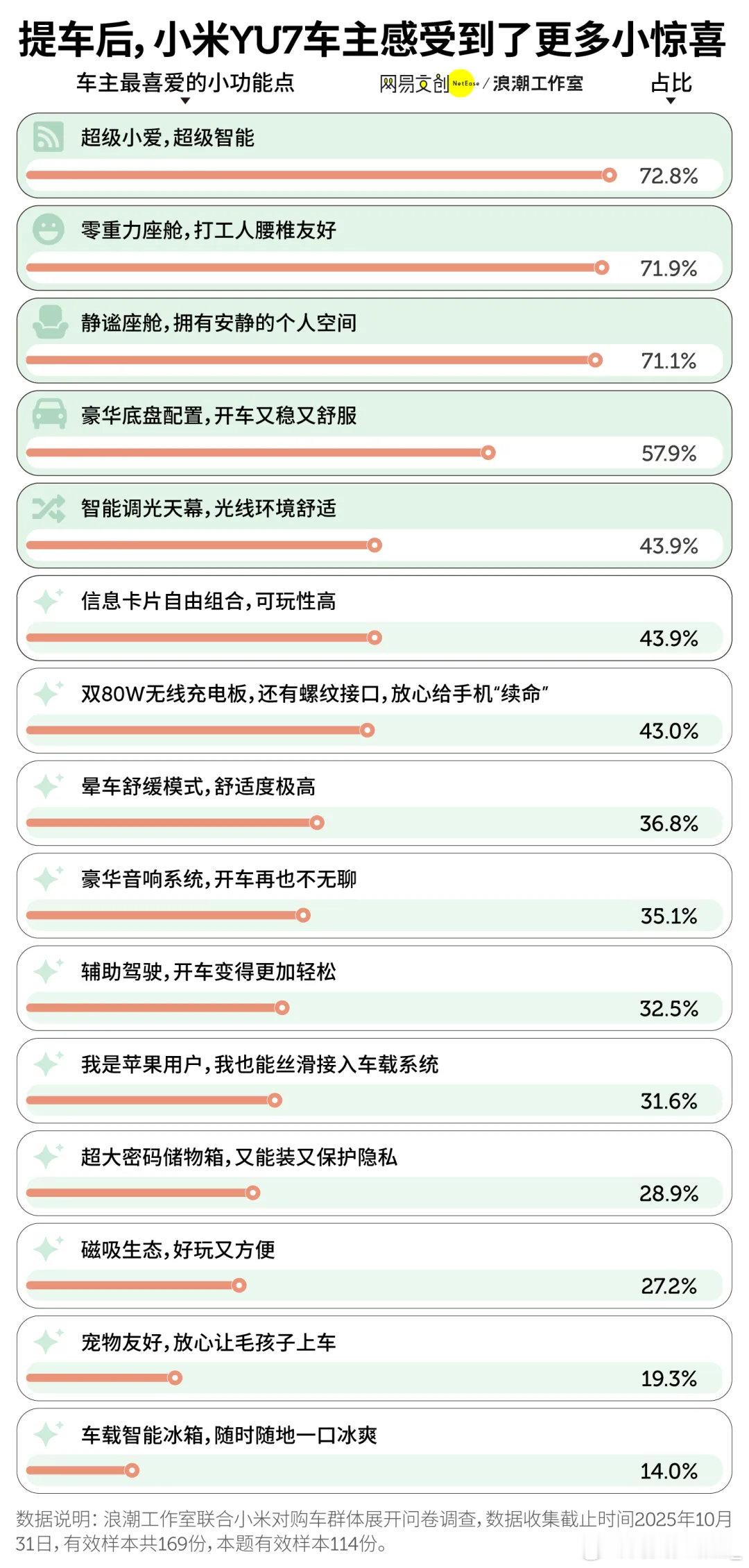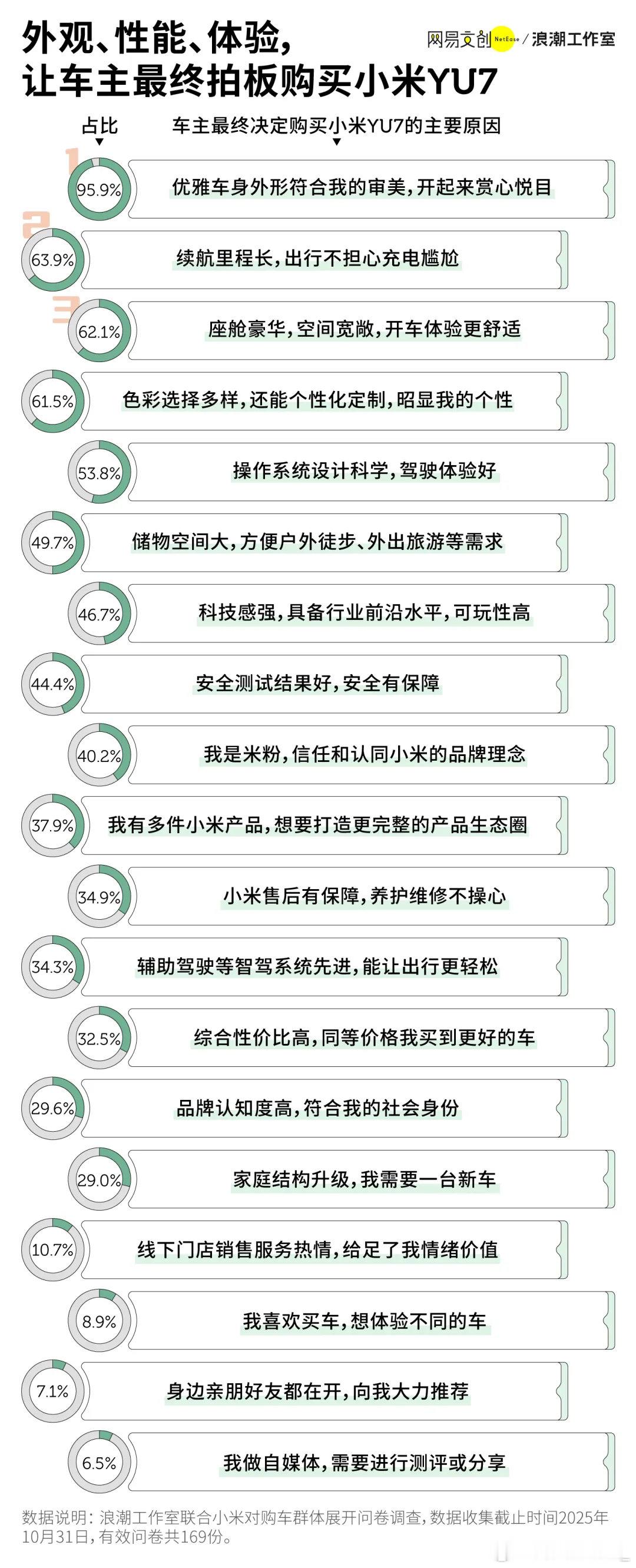 我之前和朋友很多次讨论过“品牌”的问题,我当时问他们一个问题,你们认为品牌和产品到底是什么?每个人的看法可能各不相同。我的理解是“品牌”是持续可传承的信赖,产品是品牌和集团价值观延伸向消费者的终端触手。因此,选择产品实际上就是选择企业,是相信企业能在未来持续地为自己和家庭更好的服务,而产品也是企业价值观和长期主义导向的延续。然后我们回过头来看网易浪潮这次面向YU7车主最后回收了169份问卷的调研报告,你就会发现一些很有意思的现象:表面上来说,选择小米的汽车似乎都是年轻一代,在宣发场景下被车子的外观所吸引,在深入体验后又因为续航和舒适性个性化功能决定入手,最后提车后被科技和智能功能打动,有一些本来是果粉的人也被折服成为了小米汽车的用户和粉丝。看起来逻辑上没有任何问题也解决了所有的问题是吧,但我们再回过头想想,小米汽车有一点是和友商截然不同而我们几乎完全忽视的,那就是小米汽车没有库存都是现车,要等!以上的所有内容对于大部分理性的消费者来说其实都是天然冲突的,因为它们本质上都是类冲动消费的产物,就像你因为外观喜欢一个人,往往并不会长久。所以究竟是什么让大家最后坚定选择了小米呢?答案其实就藏在问卷的更深处,也就是我一开始所说的,我们看到的这些都是假相,根本上是因为小米十来年在移动、智能制造和IoT领域的深耕让大家相信了小米造车不是一锤子买卖,大家相信小米用自己的品牌给自己的汽车命名是有绝对的自信产品不会砸自己招牌的行为。所以,这样一台看起来是外观优先、安全优先和智能体验优先的新能源车才会有这么多人愿意等接近一年的时间,这无关任何产品力,只能是出于对小米的信任。也正是这种信任,小米长期来这么多产品堆积出来的信任,让消费者最后真正下定决心购买了小米汽车,这种隐性但又一锤定音的才是最重要的。小米从来不做一锤子买卖,小米要的是消费者的心。