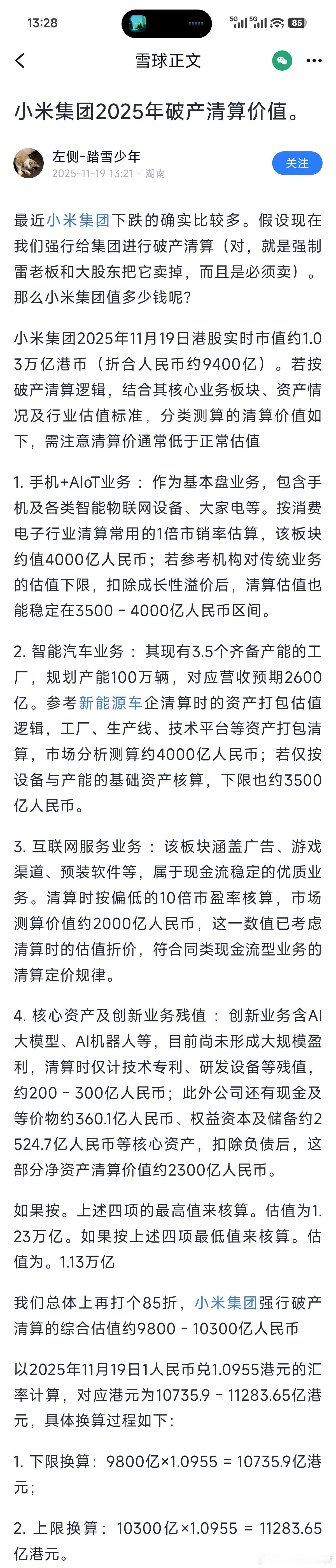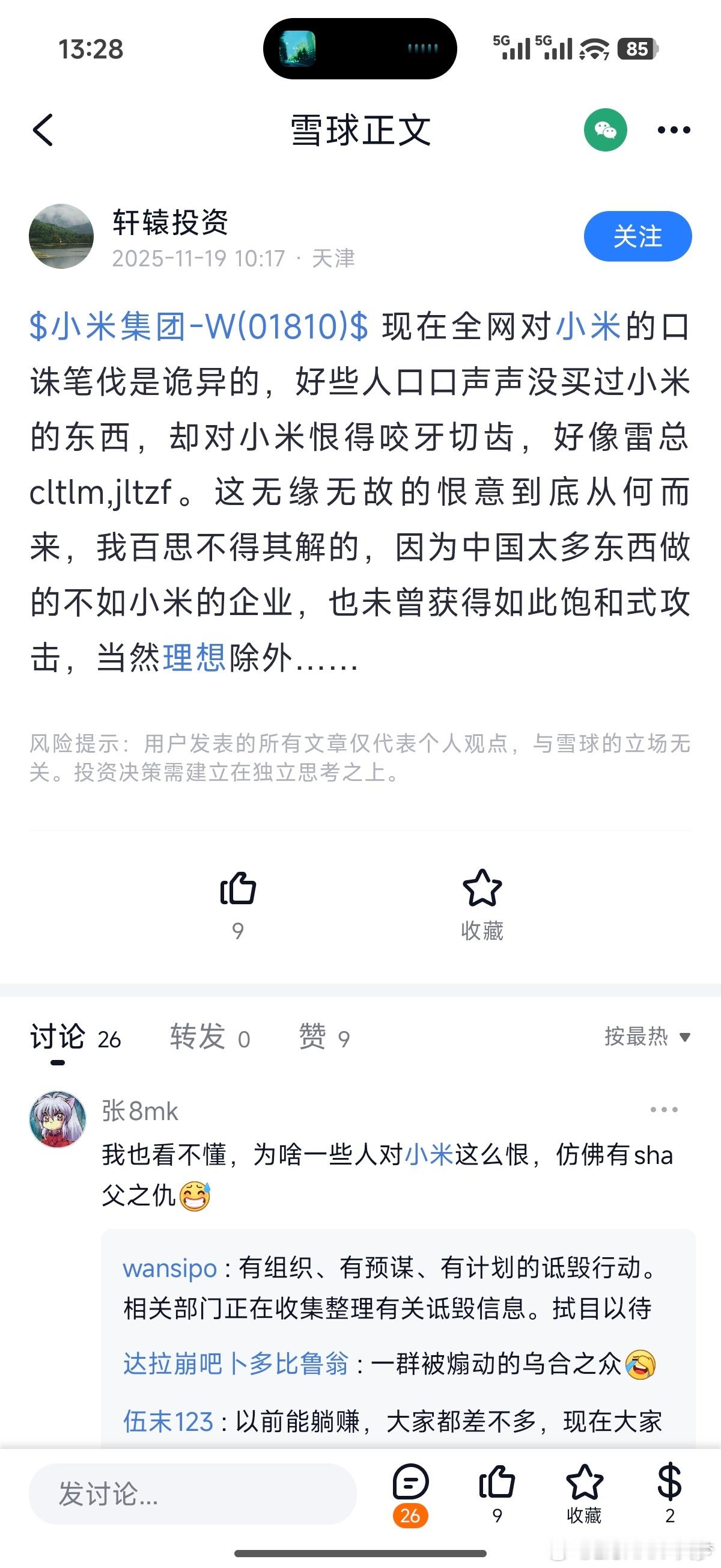 发完财报小米股价下跌不少,各个平台都看到了很多分析觉得想不通,其它原因我就不分析了,说说舆情和我自己的感受吧其实我一开始觉得舆情对资本市场不会有什么影响,现在有一些改观,或者说股市就是一个情绪放大器现在大家可以看到的是小米对外宣传相当保守,其实之前就没什么出格的,对比起某家真的好太多太多,即便如此也被抓着不放,小米几乎被要求成为一个不犯错的神,利空的事情不能有,利好的事情要超预期两三倍以上才可以所以你会发现小米做了很多完全不讲,在ai、机器人甚至说汽车工厂的投入都比我们想象的多,再加上一些空头做空,自然股价就跌了,因为你没有符合大家的预期客观的说我也亏了些,早上会有一些情绪波折,现在就还好了,因为我始终相信万事万物都要回到基本面,你做了什么事就要付出什么样的代价而对小米这个公司而言,看的就是产品是否还足够优秀,是否还能依旧得到消费者认可,以及雷总本人有什么想法变化,如果这些都没变,那么小米股价也一定会回到它的合理区间。