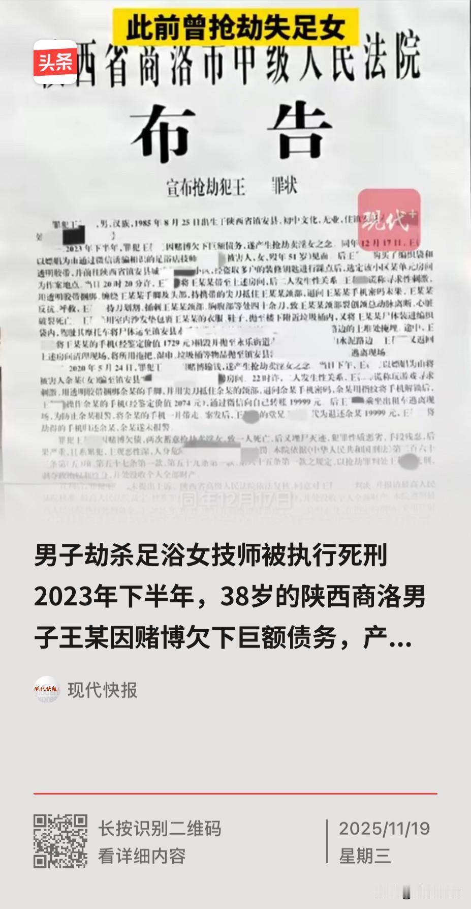 残忍至极。陕西,一男子因赌博欠下巨额债务,于是便将目光锁定在失 足女身上,于是,男子诱骗对方见面后,先是发生关系,随后又对其抢劫侵害致死,案发后,男子终于被判处死刑立即执行。 据悉,38岁男子王某因赌博欠了巨额债务,于是便产生了抢劫的念头,随后,王某约了51岁的足浴店女技师黄某见面,当晚两人发生关系后,王某挟持黄某逼迫对方交出银行卡密码,索要无果后,王某直接持刀将其侵害致死。 然而,这不是王某第一次做案,早在2020年的时候,王某就通过这样的方式,抢劫了一女子19999元,只不过,此事发生后,王某的堂兄代为退还了这笔钱,最终受害人没有报警。 目前,王某因涉嫌抢劫罪已经被执行了死刑。 事发后,网友表示,估计51岁的女技师怎么也想不到,自己出来服务最终没了命。 还有网友表示,这个事情当时在老家听说过,好像就是隔壁村的,当时以为是有人在吹牛,没想到是真的。 其实,王某被执行死刑不冤,毕竟,王某在实施抢劫无果后,侵害受害人致其死亡,那么,王某要么就是抢劫罪,要么就是抢劫罪和故意杀人罪两罪处罚。 为何最终只是按照抢劫罪一个罪名处罚? 其实,最高院有一个批复,就是行为人为劫取财物而预谋故意杀人,或者在劫取财物过程中,为制服被害人反抗而故意杀人的,以抢劫罪定罪处罚,行为人实施抢劫后,为灭口而故意杀人的,以抢劫罪和故意杀人罪定罪,实行数罪并罚。 本案中,王某在抢劫过程中,因为受害人不给钱,导致了王某恼羞成怒侵害受害人致死,那么这就是抢劫过程中致人死亡的,那么这就是抢劫一个罪名,如果王某是抢完了之后,再致人死亡的,这就是两个罪名了。 按照刑法的规定,抢劫致人死亡的,处10年以上有期徒刑,无期徒刑或者是死刑,而由于王某是故意致人死亡,情节非常恶劣,因此判处死刑立即执行,也是咎由自取了。 有人可能会问,为什么20年抢了一个受害人,对方没有报警?其实,当时的受害人身份,和本案受害人黄某差不多,都是出来服务的,而当时受害人如果报警,显然也要被依法处理,而王某堂兄代为退还了钱财,受害人选择了不追究,也害怕自己被依法处罚。 不过,由于是治安案件,所以,现在即便被警方找到了,因为超过了6个月的时效,也不会被警方处罚了。 但是,不管怎么说,从事不法行为,不仅会对自己的生命安全造成威胁,同时也会被依法处罚的。 对此,你对本案有什么看法? —————————— 关注我,带你评析法律热点,关注冷暖人生。 文章原创,抄袭必究