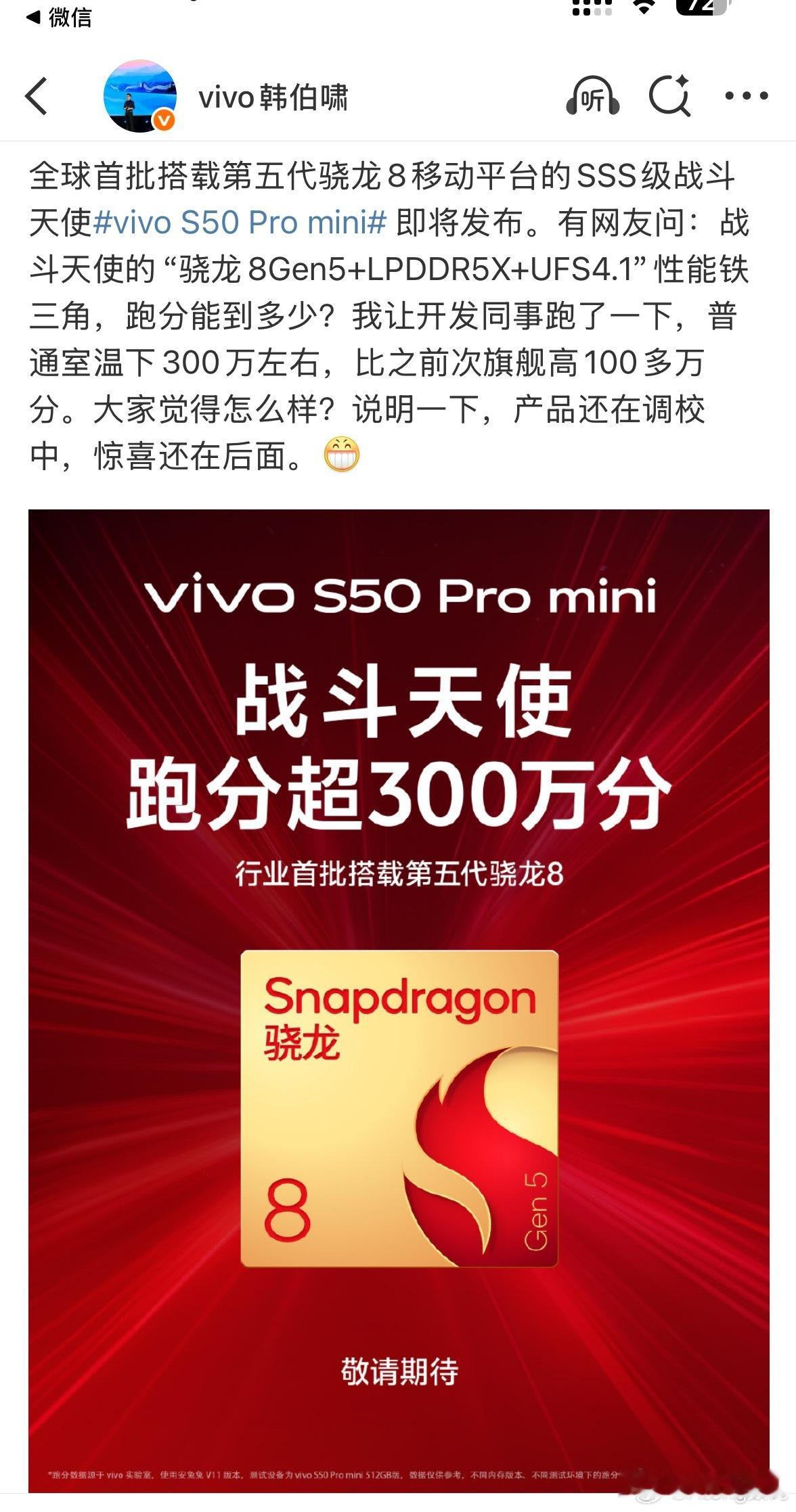 S50系列“战斗天使”首批搭载骁龙8 Gen5处理器,实测300万跑分,并且还在提升。上一代已经是好评如潮了,这代的性能+影像更上一层楼,S系列这次是真没短板,中端旗舰就应该是这样