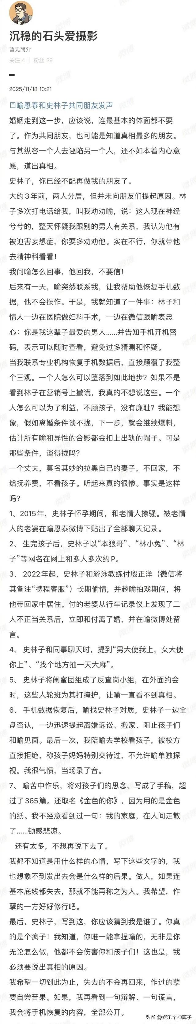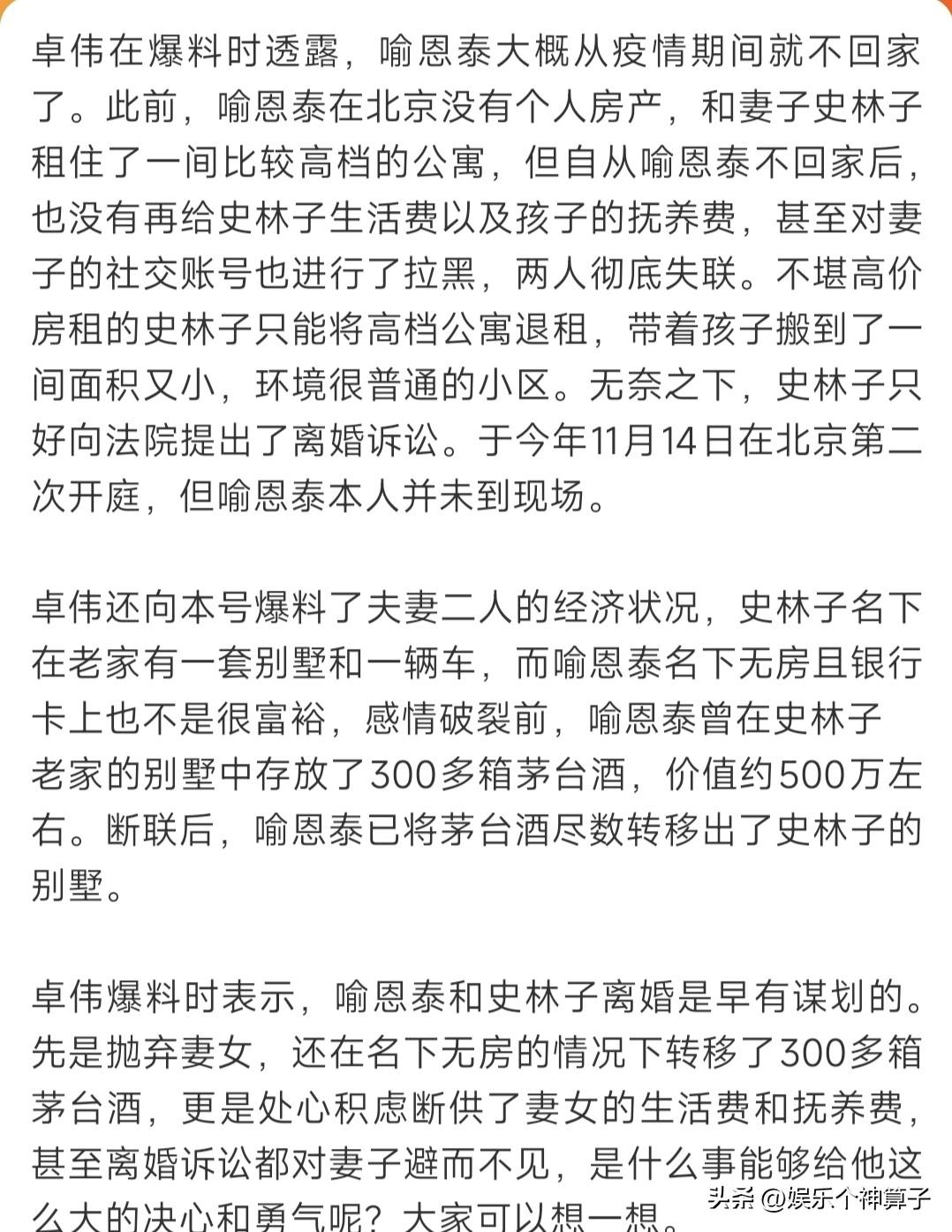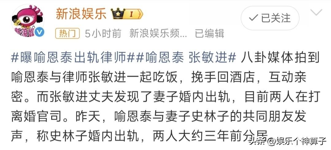 喻恩泰的好友刚放完狠话,娱记就曝出猛料! 昨日,疑似喻恩泰史林子的共同好友在社交平台发文,对女方进行爆料,最后还放出狠话:如果再看到任何辩解或谎言,会将手机恢复的内容全部公开! 11月19日,知名娱记晒出一段视频,称拍到喻恩泰和美女律师一起吃饭,最后挽手回酒店。 不得不说,这剧情来回反转,感觉电视剧都不敢这么拍。 咱就说,喻恩泰的好友刚放完狠话,娱记就曝出猛料,真的是巧合? 有点小疑惑,所谓的好友为啥知道这么多的内情?娱记手里怎么有这么多的料? 都说家丑不可外扬,毕竟夫妻一场,相信两人都不希望这些事情被曝光! 作为路人还是应该理性吃瓜,不要轻易相信网上的爆料。