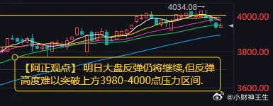 明日大盘反弹仍将继续 但反弹高度难以突破上方3980-4000点压力区间 盘前分析“今日大盘按自身技术走势将出现反弹。观察趋势量化标准3937点的站稳,关注3957点的情绪保持点能否站上”,午评“午后大盘维持谨慎乐观 趋势量化标准3937点能够站稳 但3957点的情绪保持点能否站上需要量能配合”判断符合大盘实际:市场窄幅震荡,沪指、创业板指均收红。沪深两市成交额17259亿,较上一个交易日缩量2002亿。个股跌多涨少,参与今日交易的沪深两市5160只个股中,1148只收红,涨超9%个股66只。 今日市场热点较为杂乱,板块角度看,水产概念集体爆发,中水渔业、国联水产等近10股涨停;军工板块表现活跃,江龙船艇3天2板;银行板块走强,中国银行涨超3%创历史新高;锂电板块反复活跃,金圆股份3连板;高位股明显分化,东百集团、三木集团、胜利股份、海南海药跌停。 指数表现:沪指涨0.18%,报收3946.74点;深成指跌0.00%,报收13080.09点;创业板指涨0.25%,报收3076.85点。 板块表现:512个板块中,49个收红。贵金属、军工、养殖业等板块涨幅居前,海南、燃气、影视院线等板块跌幅居前。 资金表现:大盘资金全天净流出611.35亿元,其中上证净流出252.68亿,深证净流出358,67亿。 两市成交:两市全天成交17259亿元,较上一个交易日成交额缩量2002亿元,上证成交7209亿元,较上一个交易日成交额缩量700亿元。 明日猜想:市场情绪低至冰点,成交量大幅萎缩,缩量状态下是突然大涨还是在沉默中继续跌跌不休?阿正观点:上证指数上方重大压力在3980-4000点区间,如果没有外力(政策面刺激或外围市场大涨),突然大涨条件并不具备。但反弹仍将继续,只是反弹高度难以突破上方压力区间。