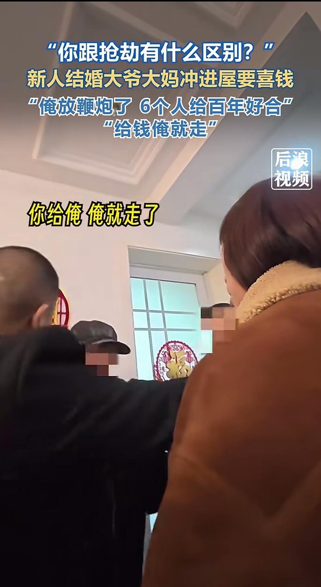 新郎都把新娘迎进家门了,这几位大爷大妈竟冲进屋里强行索要喜钱,声称他们放了鞭炮,仿佛这对新人欠了他们钱一般,这种行为实在太过霸道! 而这一事件就发生在近日的山东临沂。画面中蒙着脸的那位大爷闹得最凶,不给钱就赖着不走,简直就像明抢一样。真不明白是什么让他们如此嚣张,难道是当地风俗使然?要是这些曝光的画面被他们子女的朋友看到,真不知会作何评价。 这种背离闹喜初衷的风俗,确实该改改了,否则,老人们在闹喜这件事上会更加肆无忌惮! 冬日生活打卡季