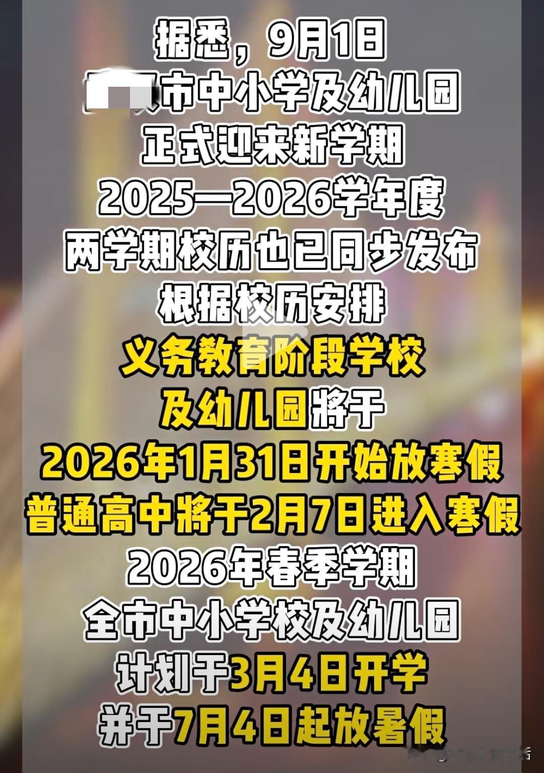 寒假放假安排来了 这几天陆陆续续各学校就要召开家长会了,这几个月过得特真快。感觉才开学一样,一眨眼间就11月底了。是不是说明寒假也快到了! 近日看到有消息称湖北一地方公布了2025-2026的校历,其中明确了2026年的寒假时间。义务教育段1月31日起开始放寒假,普通高中2月7日开始放寒假!我想其他地区的寒假放假时间应该也是大致相同吧! 话说你们都期待寒假的到来的么! 新春放假时间 节日放假安排 中小学假期安排 放寒假时间表 寒暑假调整 寒暑假安排 寒假时间表