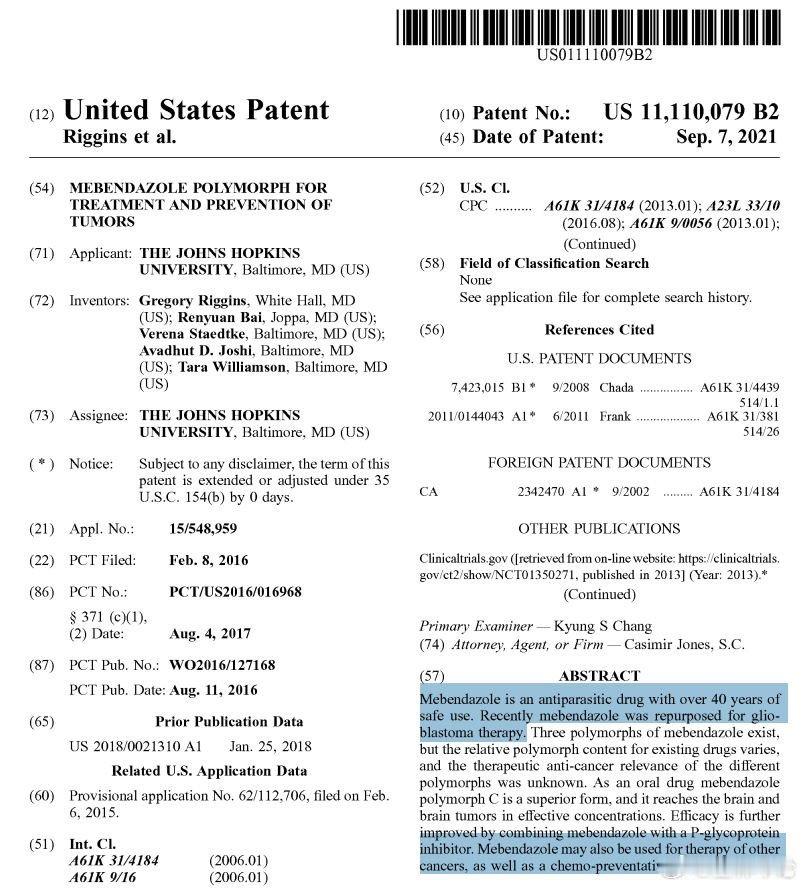 现在他们要申请专利了?!价格肯定要飙升了在显微镜下,某些胶质母细胞瘤组织可能看起来像绦虫幼虫是的,晚期脑瘤和寄生虫看起来可能非常相似为什么肿瘤科医生不常规进行寄生虫检测呢因为治疗费用低廉甲苯咪唑,价格低廉每片只需几分钱2021 年霍普金斯大学为治疗肿瘤申请了新版本的专利