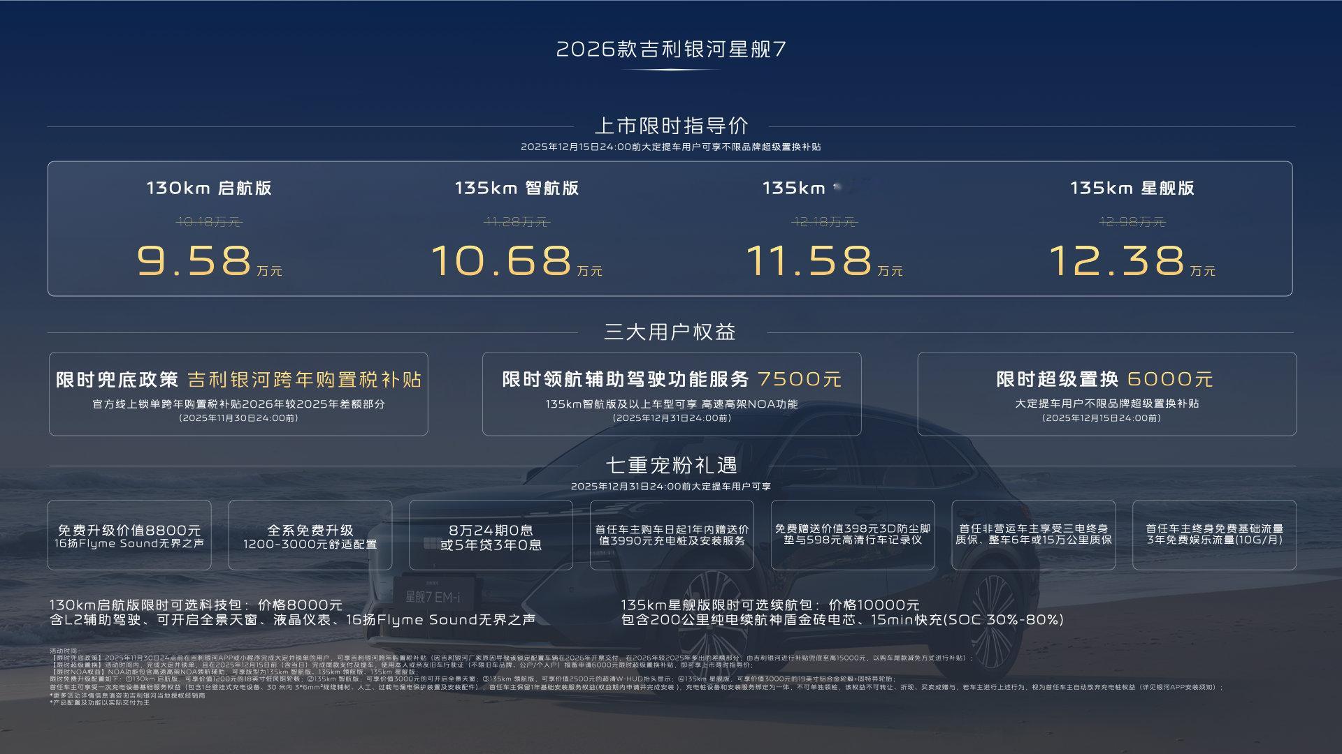 9.58万元起,这是2026款吉利银河星舰7 EM-i今晚公布的上市售价,不光比老款便宜2000,起步续航还干到130km要知道,去年星舰7发布前,我也参加了它的试驾会,当时吉利银河正处在全面上量的关键节点,星舰7强不强,直接决定银河能不能跟榜首那位坐一桌事实证明,星舰7做到了,不仅稳居全品类插混SUV的TOP5阵营,更成为吉利出海的主力军,在欧洲、东南亚、南非等地区更是插混主力军到了2026款,吉利银河没有为了求新而大刀阔斧,而是强化长板、补齐短板,让这个水桶车能够承载更全面的品质例如新增的星海蓝车色、尺寸增至15.4英寸的Flyme Auto车机、前排侧窗的双层隔音玻璃,以及对北方用户更加友好的后排加热和方向盘加热,都是满脑子降本的友商心心念念想砍掉的东西,但关乎用户体验,星舰7该上就得上再比如热效率再提至47.26%的混动专用发动机,结合175kW的大电机,以及雷神AI电混2.0的算法优化,CLTC亏电油耗直接从3.75L/100km骤降至3.15L/100km,做到“油电同费”;低配的纯电续航也从55km增加到130km,纯电通勤更加从容当然,千里浩瀚H3也没有缺席,地平线的J6M芯片,支持高速NOA、城市通勤NOA、HPA记忆泊车、遥控泊车、离车泊入以及辅助驾驶小蓝灯,把仅剩的短板也给补齐了10万级想买插混SUV,星舰7一直绕不过去,以前如此,现在也如此,再加上顶配还藏了一手纯电续航200km的大电池选装,看来吉利银河是奔着冲击销冠来的……
