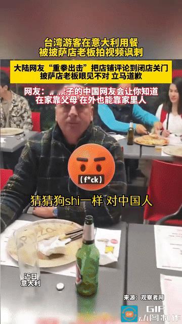 网友误会了:意大利餐厅,几个台湾同胞在意大利用餐,期间老板询问他们是来自哪里,是中国人吗? 而他们回答来自台湾,但并没有说自己是中国人! 老板一听就开始用本地语言嘲 笑他们说:“太好笑了,台湾人耶!”一边说还一边指着几个人笑。他们听不懂意大利语,还以为老板在笑着跟他们打招呼呢,也都笑着挥手回应! 这个视频被在意大利的华侨看到,觉得店老板欺负了我们的同胞,决定给同胞报 仇。后面把店铺评论到不敢开门了。 店老板这才意识到问题的严重性,赶紧又发视频道歉! 但我觉得网友这次是不是骂错了呢?感觉老板问他是中国人吗 ,他说是台湾人 ,老板都感觉他不承认自己的国籍才怼了他,而不是因为他是中国人,这是我的理解。所以同胞们是不是骂错了呢? 对此你怎么看? (视频来源:商丘手机台,侵删[祈祷])