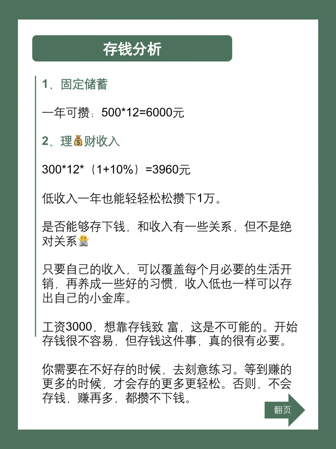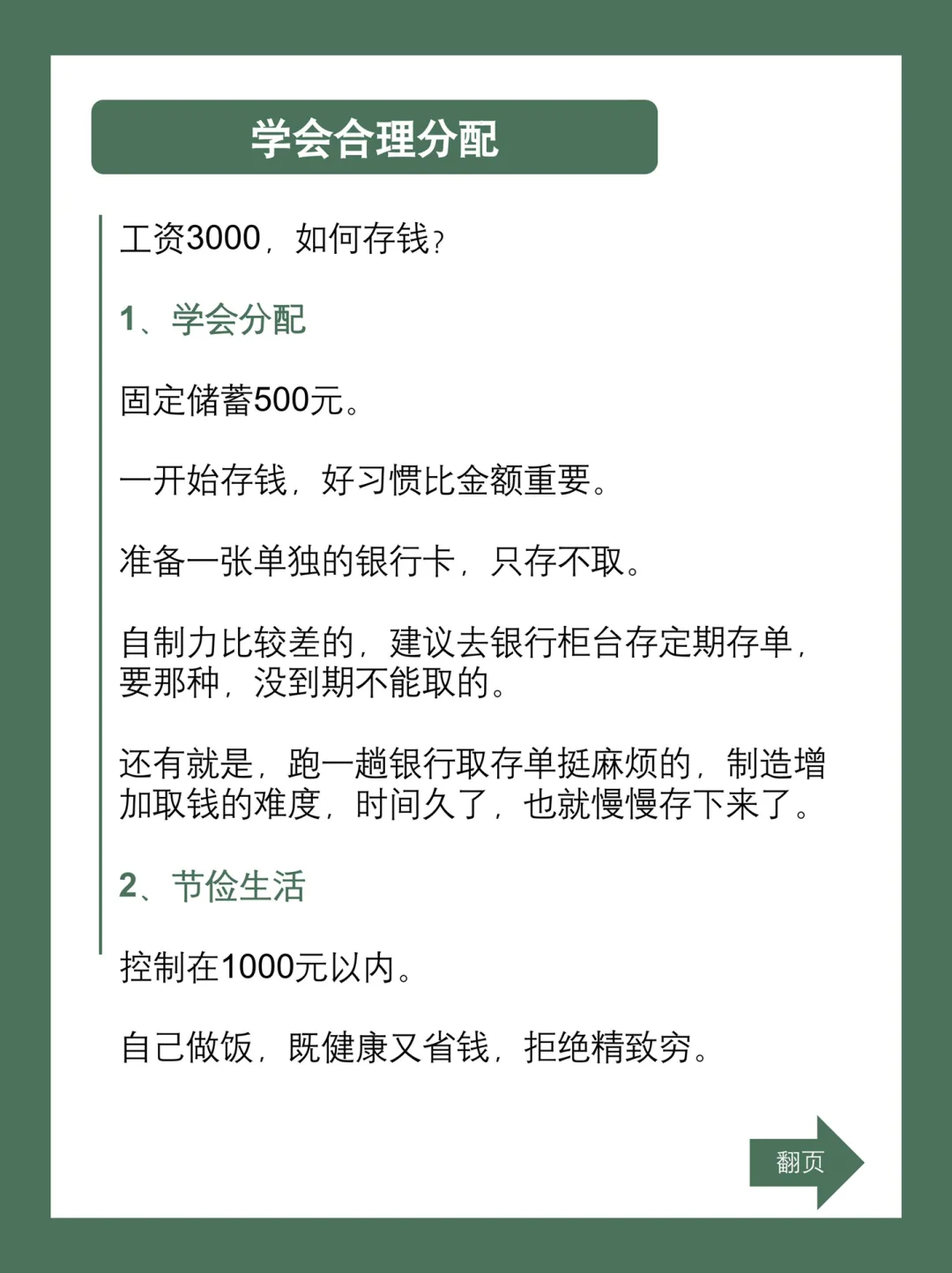 工资3000,要接受这个阶段的活法。想靠这个工资存钱致 富,这是不可能的。刚开始存钱的时候,都不容易,但存钱这件事,是真的必要。