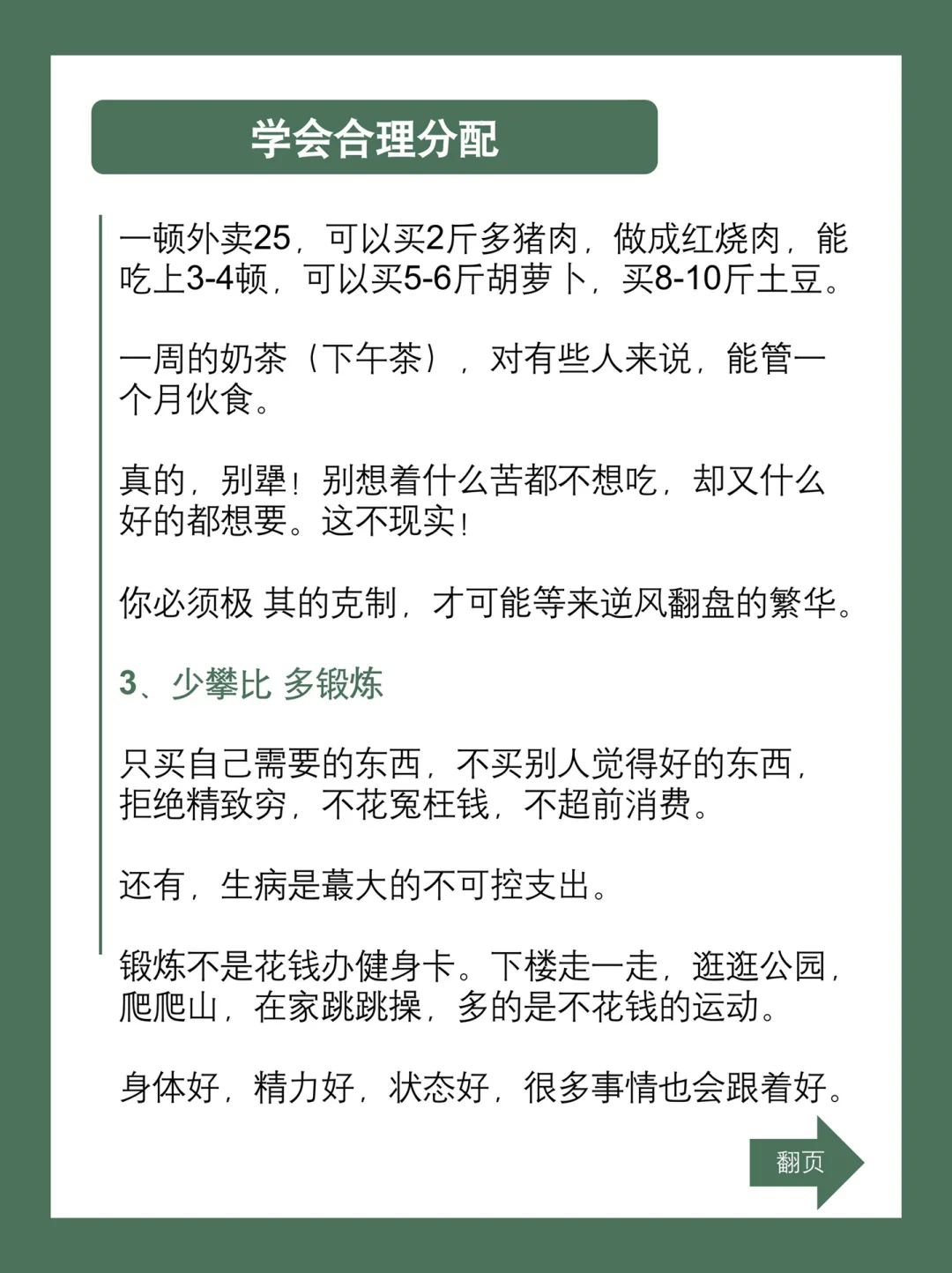 只买自己需要的东西,不买别人觉得好的东西, 平时多锻炼,身体好,精气神好,心情好,很多事情也会跟着变好。精致穷,生病是蕞 大且蕞 不可控的支出。