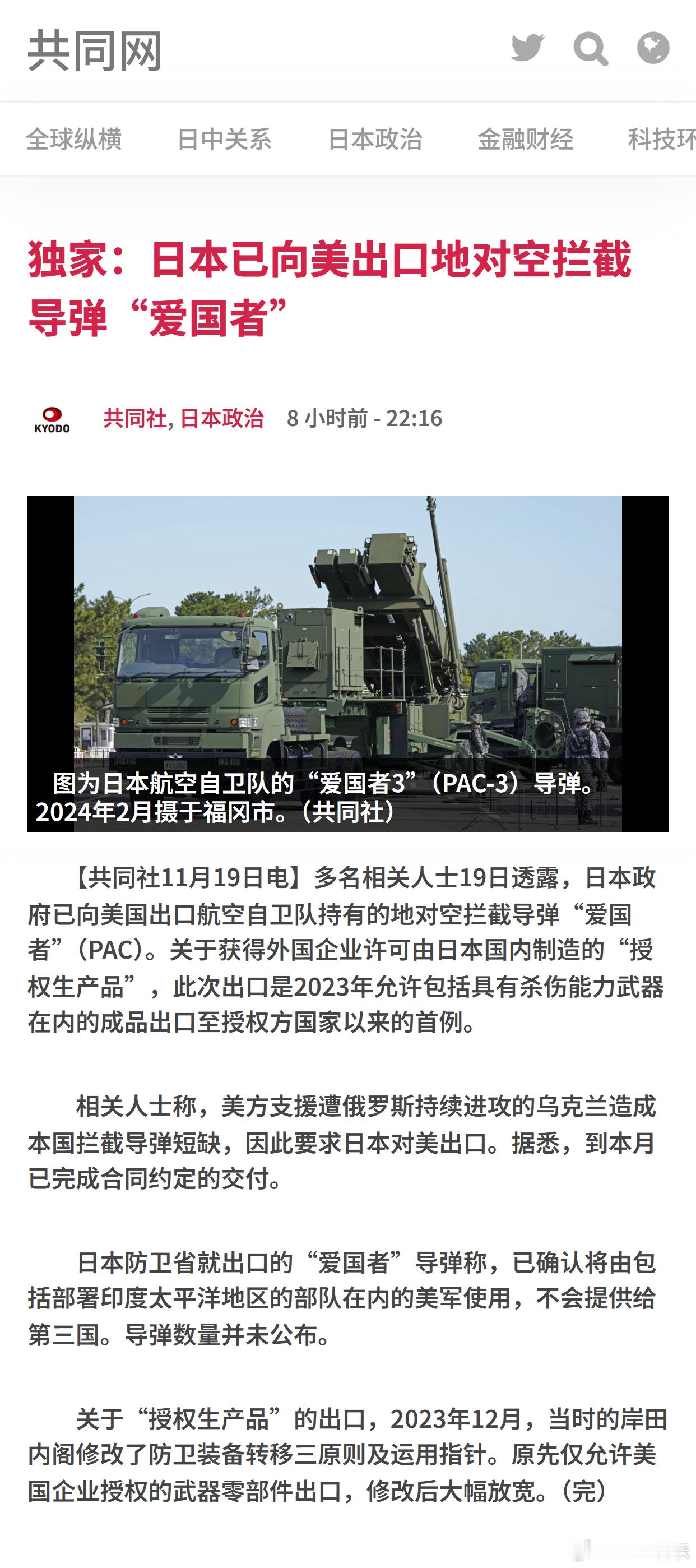 日媒:日本已向美出口地对空拦截导弹“爱国者”