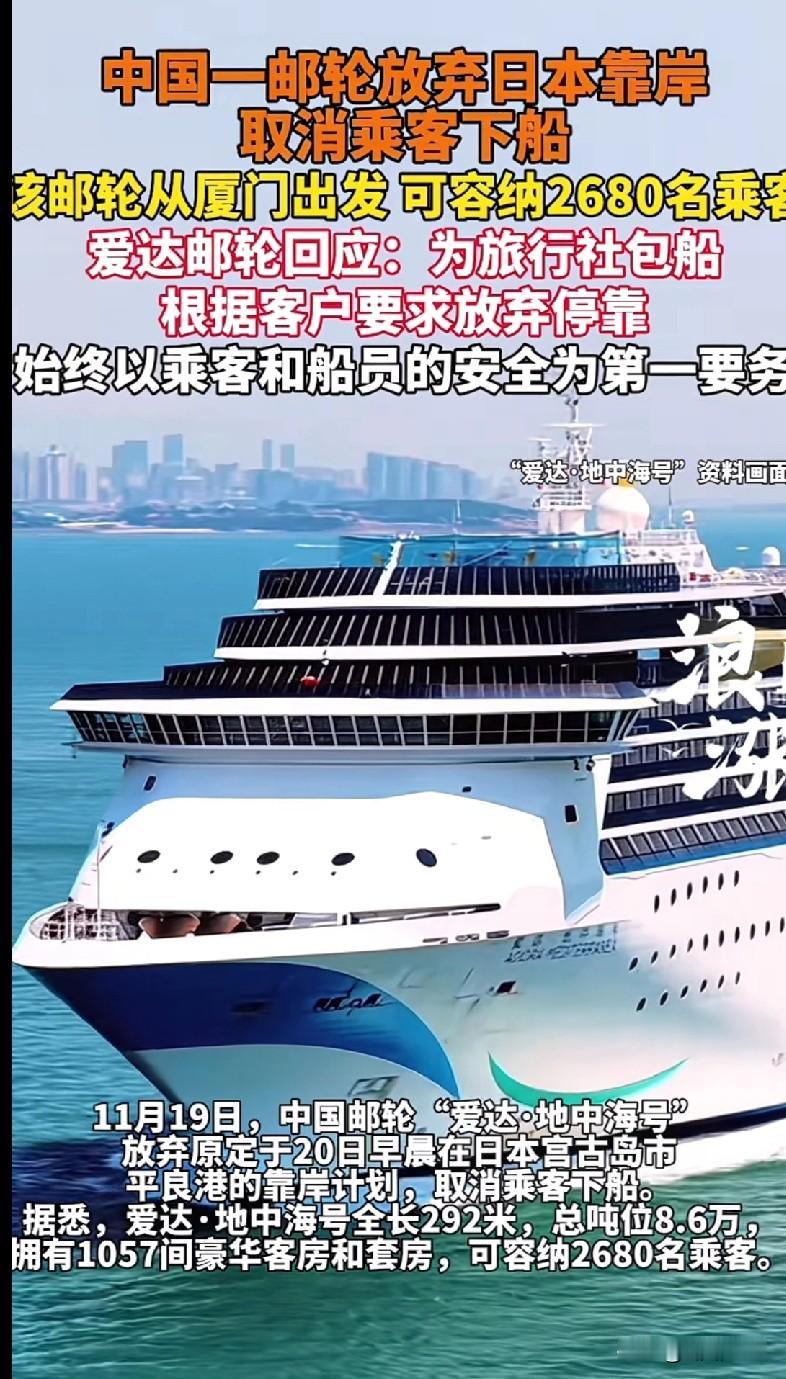 刚从厦门出发的邮轮,说不去日本就不去了!2680名乘客集体“改行程” 这波操作太硬气了!刚从厦门开出去的“爱达·地中海号”邮轮,直接取消了日本宫古岛的靠岸计划,2680名乘客都不用下船了! 这船可是能装近3000人的豪华邮轮,本来定好20号早上在日本靠岸,结果说取消就取消——邮轮方回应是“旅行社包船,按客户要求调整”,核心还是把安全放第一位。 评论区全在说“干得漂亮”,毕竟现在大家对去日本的行程都挺谨慎的,这波既顺了乘客的心意,又把安全稳稳拿捏住了。 292米长的大船说改路线就改,这效率和态度真的没话说!有这安全感,坐船都踏实多了~