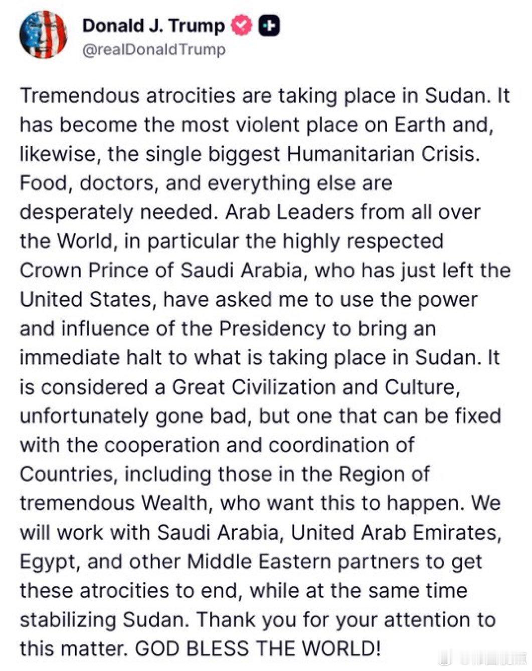 特朗普总统11月19日:苏丹正在发生巨大的暴行。它已经成为地球上最暴力的地方,同时也是最大的人道主义危机。食物、医生,以及其他一切都急需。来自世界各地的阿拉伯领导人,尤其是刚刚离开美国的、备受尊敬的沙特阿拉伯王储,已经请求我利用总统职权的力量和影响力,立刻停止苏丹正在发生的事情。它被视为一个伟大的文明和文化,不幸地变得糟糕了,但在包括那些来自极其富有地区、希望这一切发生的国家的合作与协调下,它是可以被修复的。我们将与沙特阿拉伯、阿拉伯联合酋长国、埃及以及其他中东伙伴合作,结束这些暴行,同时稳定苏丹。