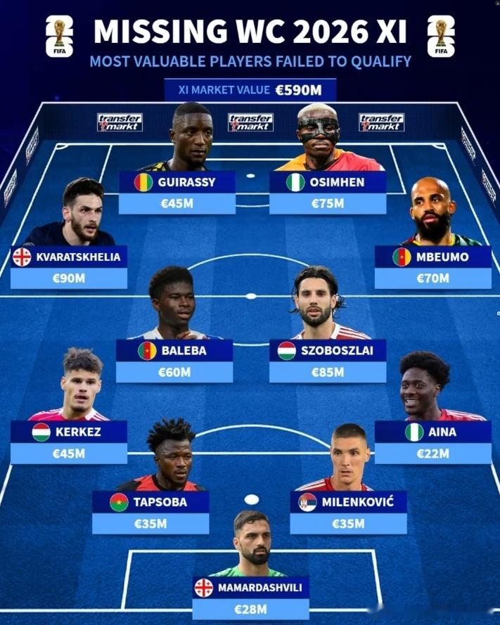 德转列出无缘2026世界杯身价最贵阵(单位:欧元)↓前锋:克瓦拉茨赫利亚(格鲁吉亚、9000万)、吉拉西(几内亚、4500万)、奥斯梅恩(尼日利亚、7500万)、姆伯莫(喀麦隆、7000万)中场:巴莱巴(喀麦隆、6000万)、索博斯洛伊(匈牙利、8500万)后卫:凯尔凯兹(匈牙利、4500万)、塔普索巴(布基纳法索 、3500万)、米伦科维奇(塞尔维亚、3500万)、艾纳(尼日利亚、2200万)门将:马马尔达什维利(格鲁吉亚、2800万)