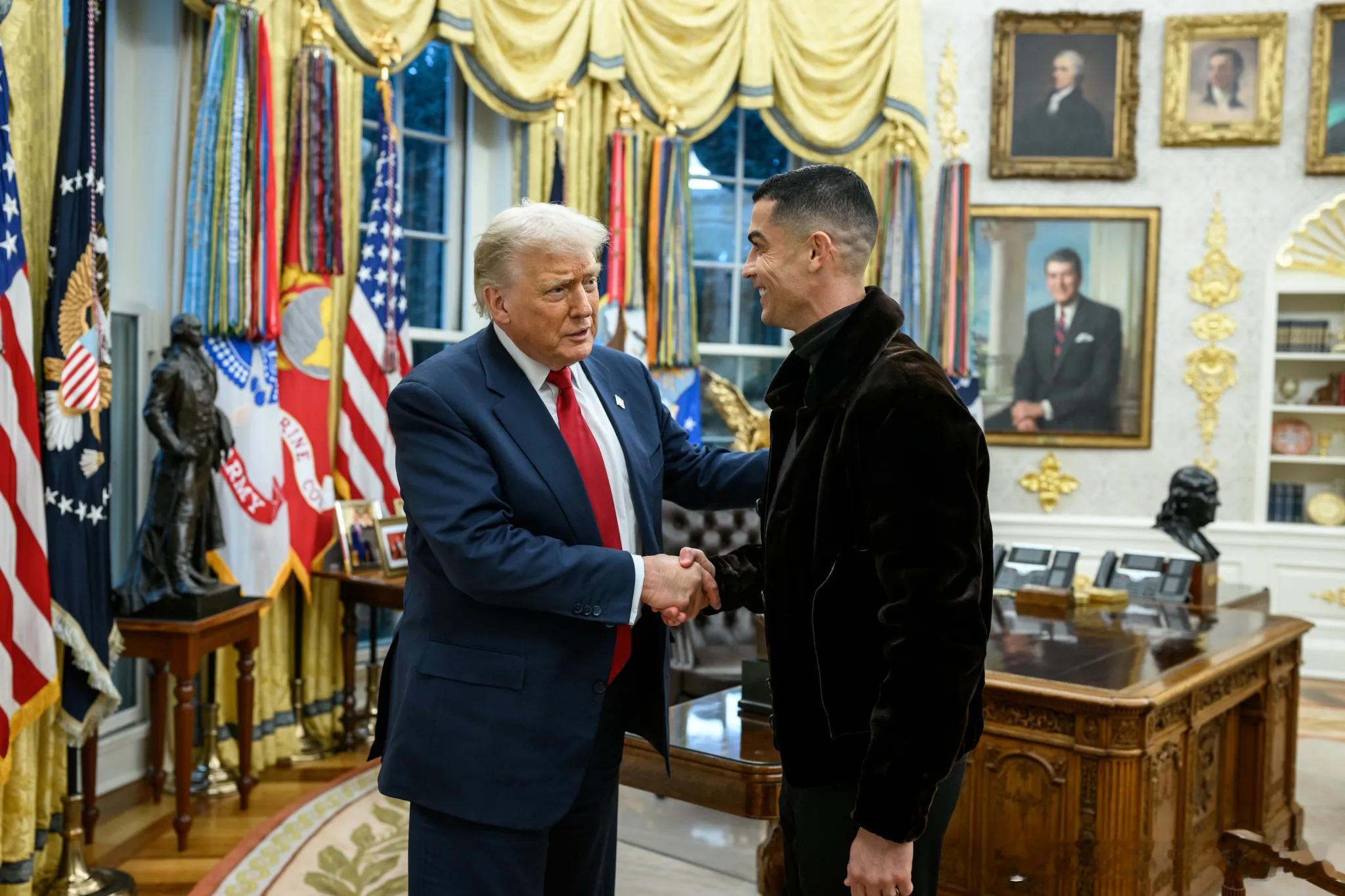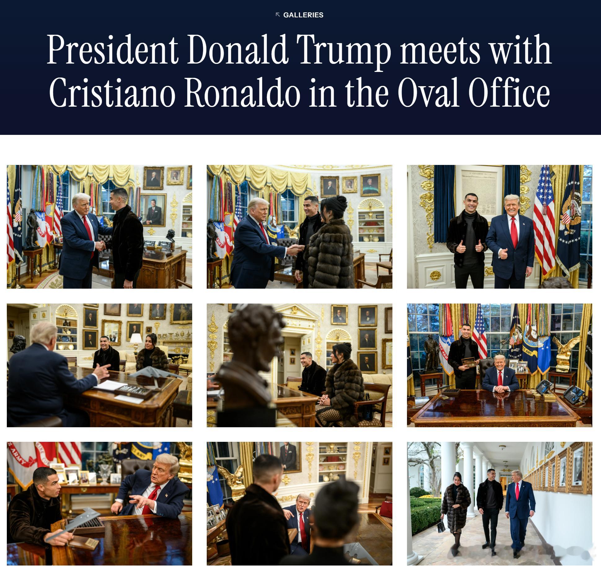 排面拉满!白宫官网发布了C罗携未婚妻乔治娜与特朗普在白宫会面、交谈并合影的官方组图。
