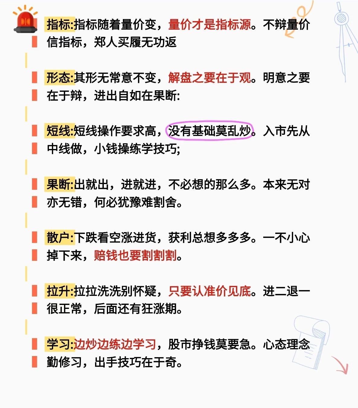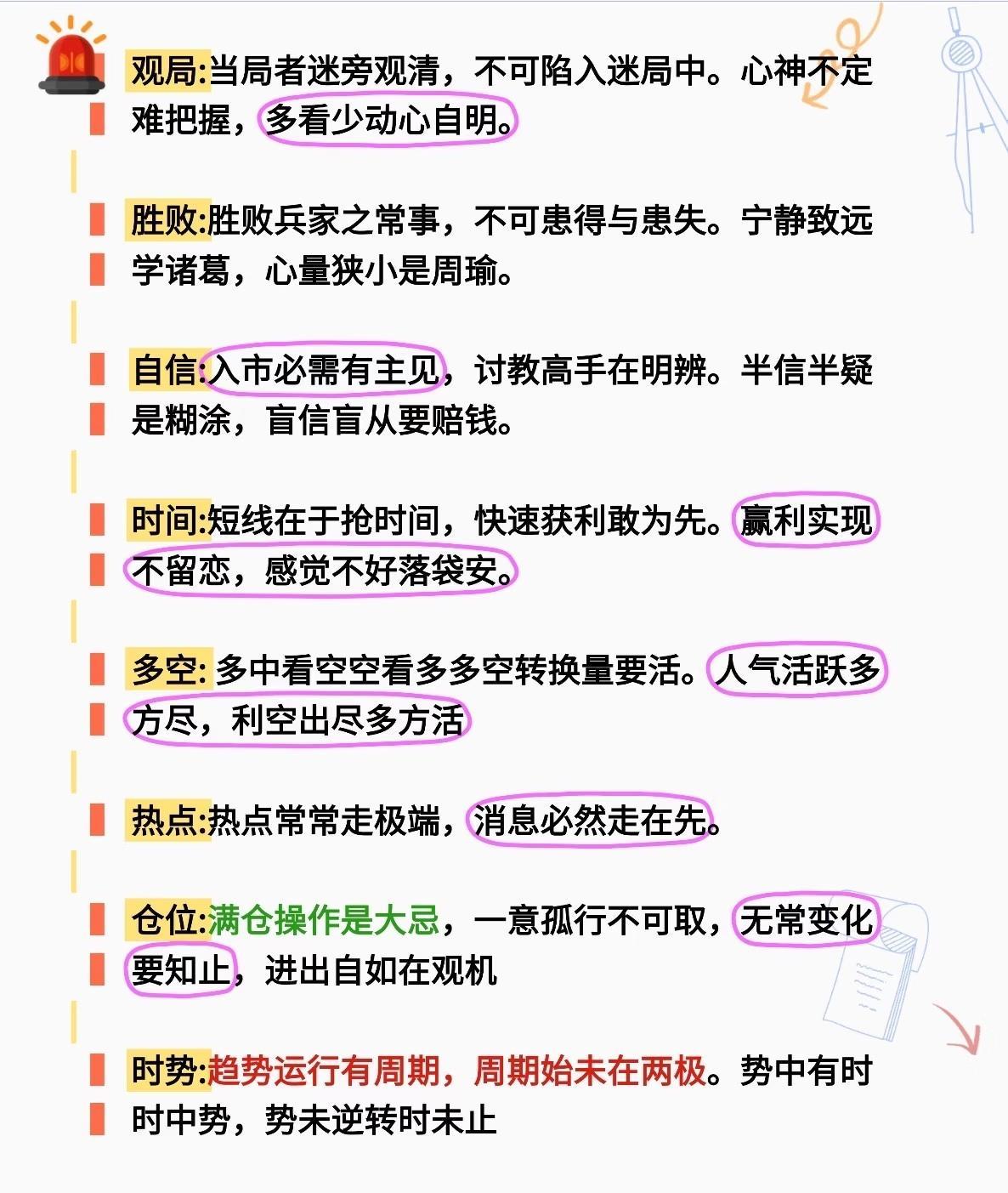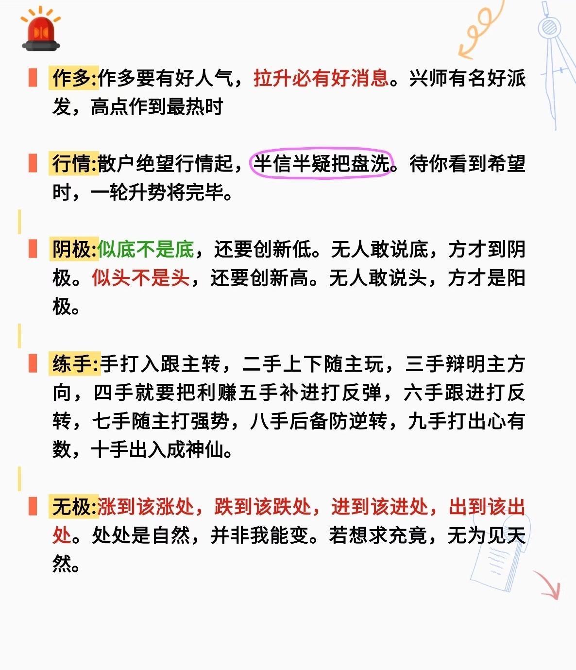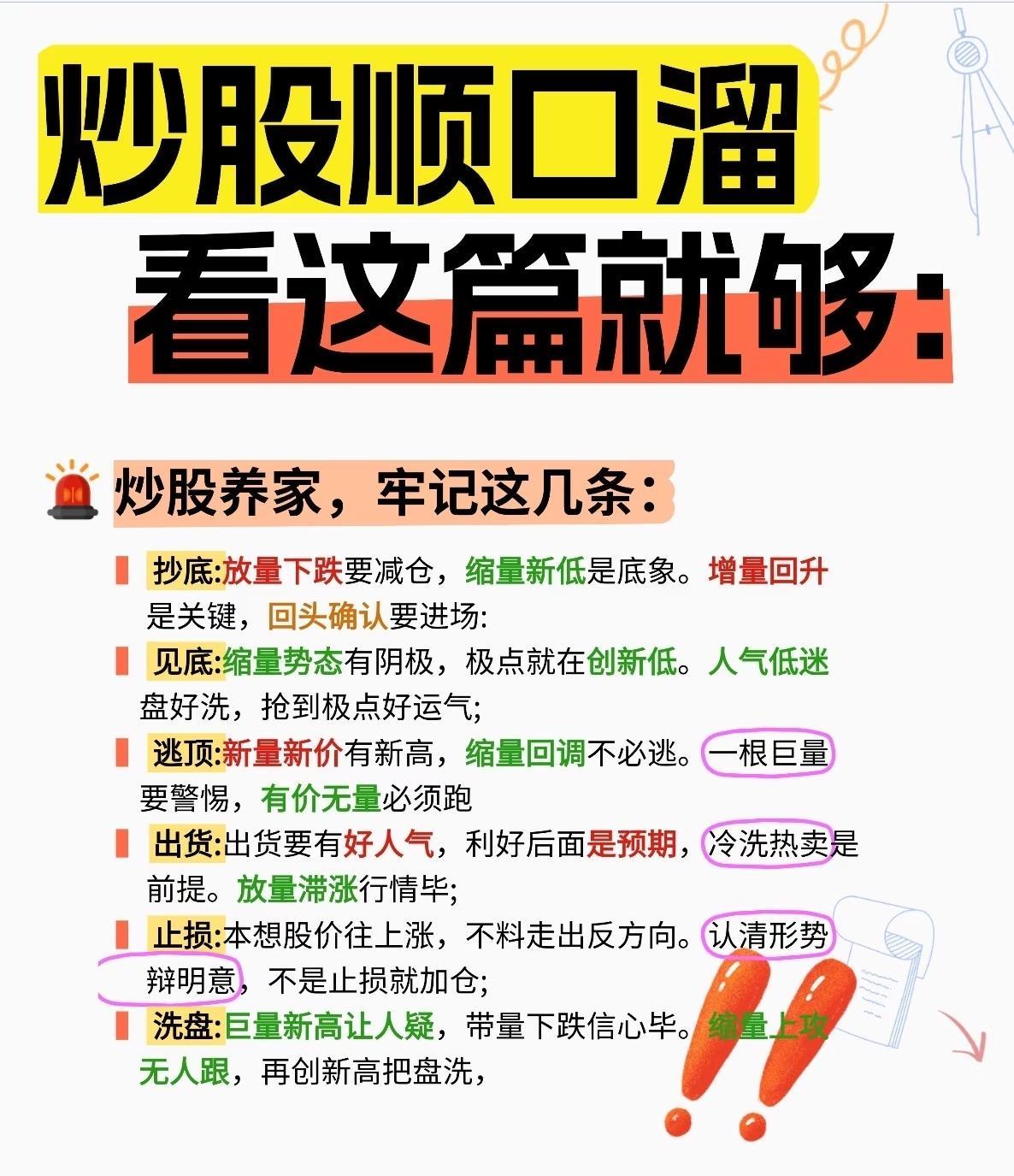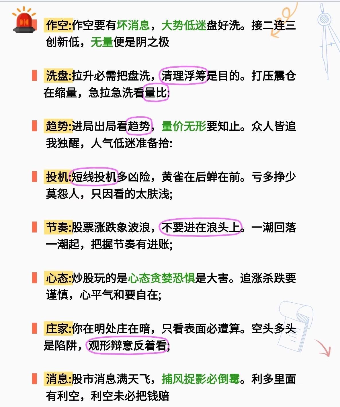 围绕股票投资总结了实用技巧与经验:1.炒股口诀:强调抄底(缩量新低是机会)、见底(人气低迷时介入)、逃顶(巨量或无量上涨要警惕)、止损(反向走势及时认错)、洗盘(缩量下跌可能是洗盘)等关键操作要点。2.投资理念:包括作空(需坏消息配合)、洗盘(清理浮筹)、趋势(顺势而为)、投机(风险高需谨慎)、节奏(避免追涨杀跌)、心态(忌贪恐)、庄家(反向思考)、消息(辨别真伪)。3.操作要点:指标和形态要结合量价,短线需经验,散户易追涨杀跌,拉升阶段常有洗盘,投资需持续学习。4.交易策略:作多靠人气和消息,行情常始于散户绝望时,阴极/阳极(极端点位)是关键,通过练手提升技巧,市场自有规律(无为而治)。5.投资心态与纪律:观局要冷静,胜败平常心,自信需独立判断,短线重时机,多空转换灵活,热点跟消息,仓位忌满仓,时势(周期)决定趋势。核心:炒股需结合技术(量价、指标、形态)、策略(抄底逃顶、仓位控制)、心态(冷静、自信、忌贪恐),并持续学习,顺势而为。