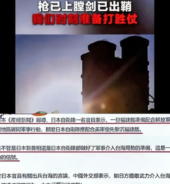 日本自卫队员表示:一旦开战,日本自卫队将与美军击沉福建舰!   要知道这几天的中日关系就像一根紧绷着的弦,这一切的原因就是高市早苗的那些不正当言论,这无疑是对我们的一种挑衅。   日本自卫队的态度更是将挑衅带到了新的高度,可要知道,他这是把美国也算上了,可现在的美国明显不想掺和这件事,所以日本的算盘大概率是打错了。   再说了,咱们也明显不带怕的,咱们的回应铿锵有力,这不仅仅是对日本的警示,更是表示咱们对台湾问题的一个态度,不管是谁想染指台湾问题,咱们都会好好“招待”他的。   日本的“强硬”确实带动了国内不少人的情绪,可看清事实的日本人民又纷纷让高市早苗下台。   我们热爱和平并不表示咱们可以“忍气吞声”,日本应该好好考虑,能不能承受的住代价。