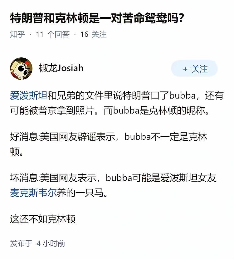这难道就是所谓的“正史不一定正,但是野史一定够野”吗?开始流传的是特朗普和克林顿,现在又流传成了特朗普和马!这事如果继续传下去,那不知道还有啥东西流传出来呢! 怪不得特朗普现在要全面解密“爱泼斯坦”案档案了,再不解密此案的档案,特朗普看到流传的角色,恐怕要气绝了。