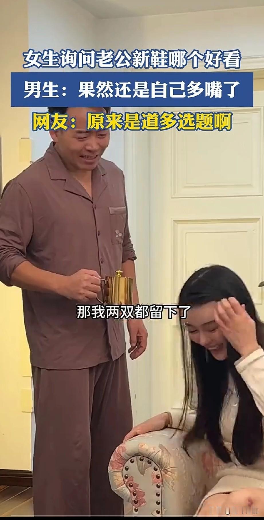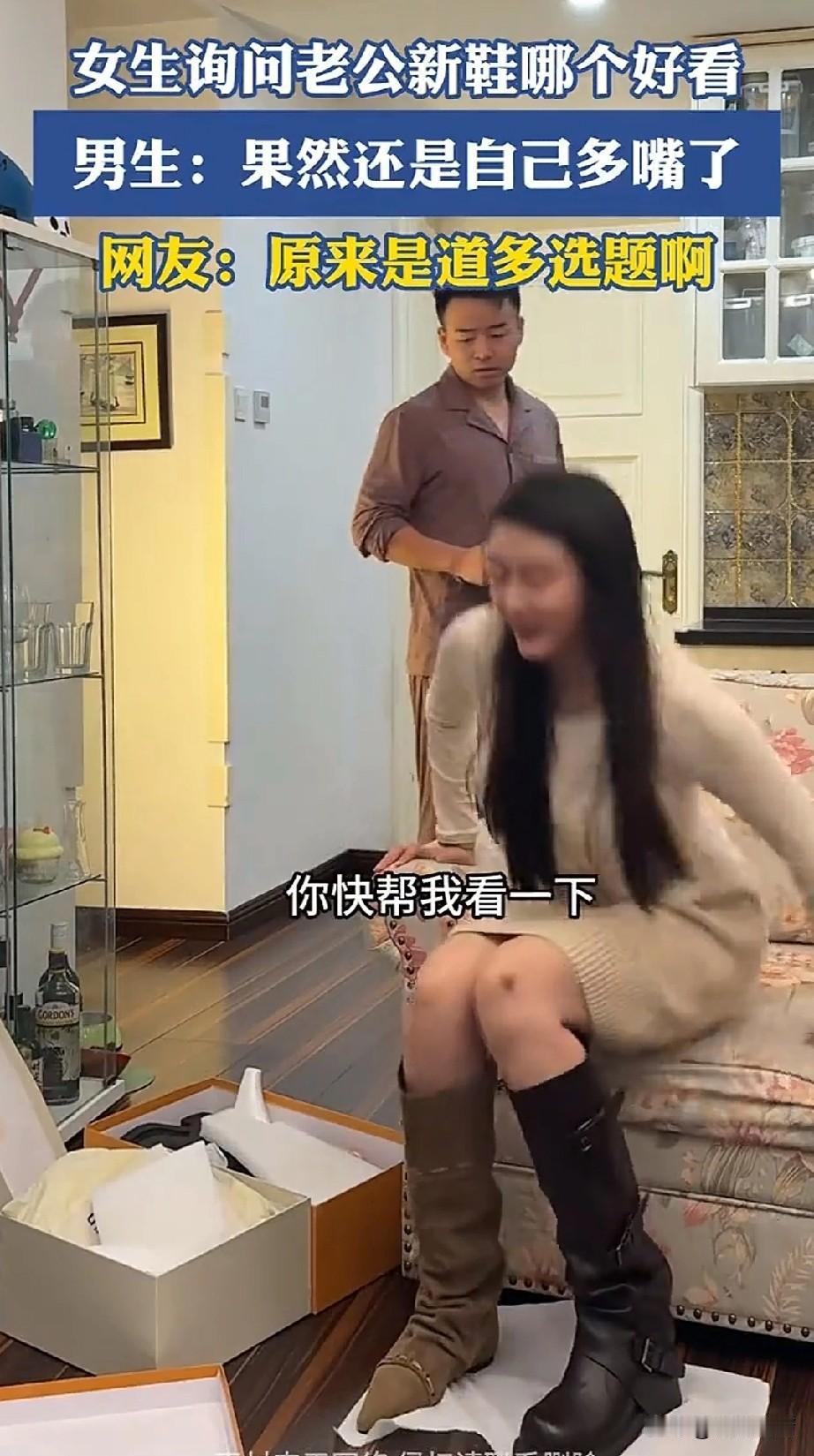 女生询问老公自己新买的靴子哪双好看,老公看着一米八大高和媳妇, 说那双卡其色的靴子好看, 女子开心不已, 表示这双卡其色靴子花了1200元, 老公有点后悔了, 说那双棕色的也不错, 老婆将信将疑, 又仔细看了看粽色的靴子, 觉得这双也不错, 老公表示棕色的很搭配她的衣服, 还显得腿特别长, 老婆表示既然这样, 那这两双都留下吧! 老公这才发觉多嘴了, 看得出来两人平日生活情趣不少? 婚姻与家庭 深卡其色穿搭 靴子洋气高级 卡其色高跟鞋 卡其色靴子搭配 深卡其色裤子