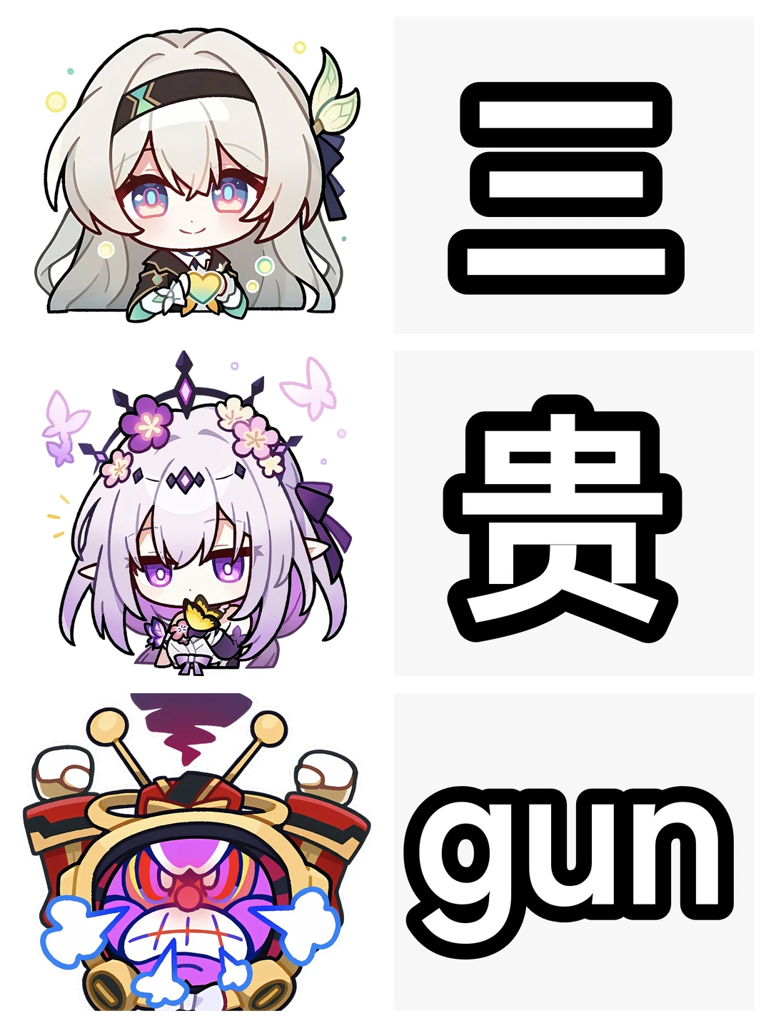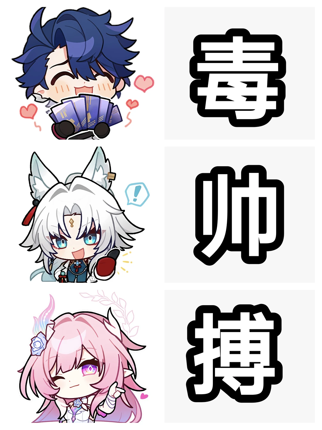 阿格莱雅——鞋,合成两双速度鞋就赢了~ 白厄——甲,三反甲在手,天下我有~ 青雀——叠,摸一次牌,三位高达叠一层~ 桑博——毒,双鞋一毒瓶,请开始你的表演 飞霄——帅,抛开伤害,追击队的特效真的帅 昔涟——搏,谁能忍住不去搏一搏三星昔涟呢 流萤——三,只有三星流萤才能拯救击破队 遐蝶——贵,燃血真的吃星魂和练度 电视机——gun,请你离开星穹铁道,谢谢