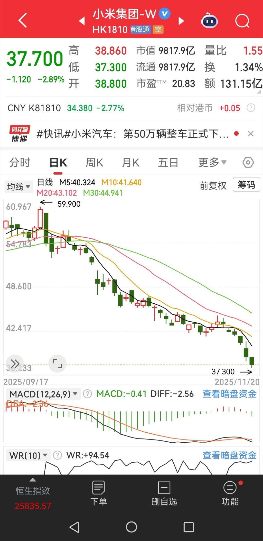 小米是怎么了,怎么跌跌不休了,还好我55就卖了,不然也亏的要哭了!