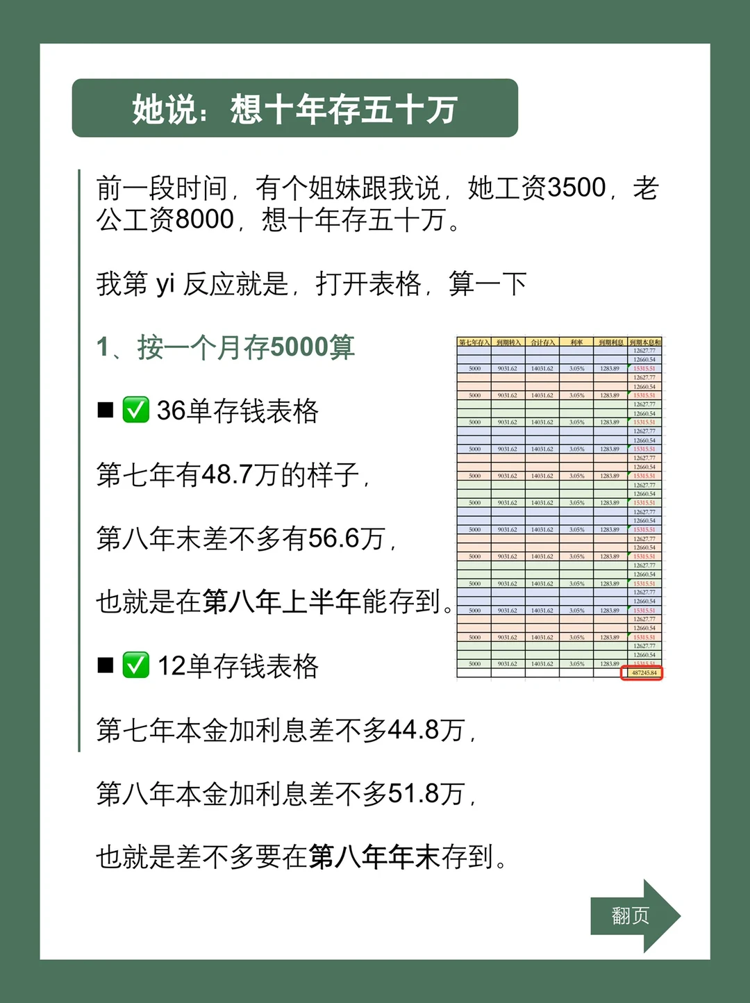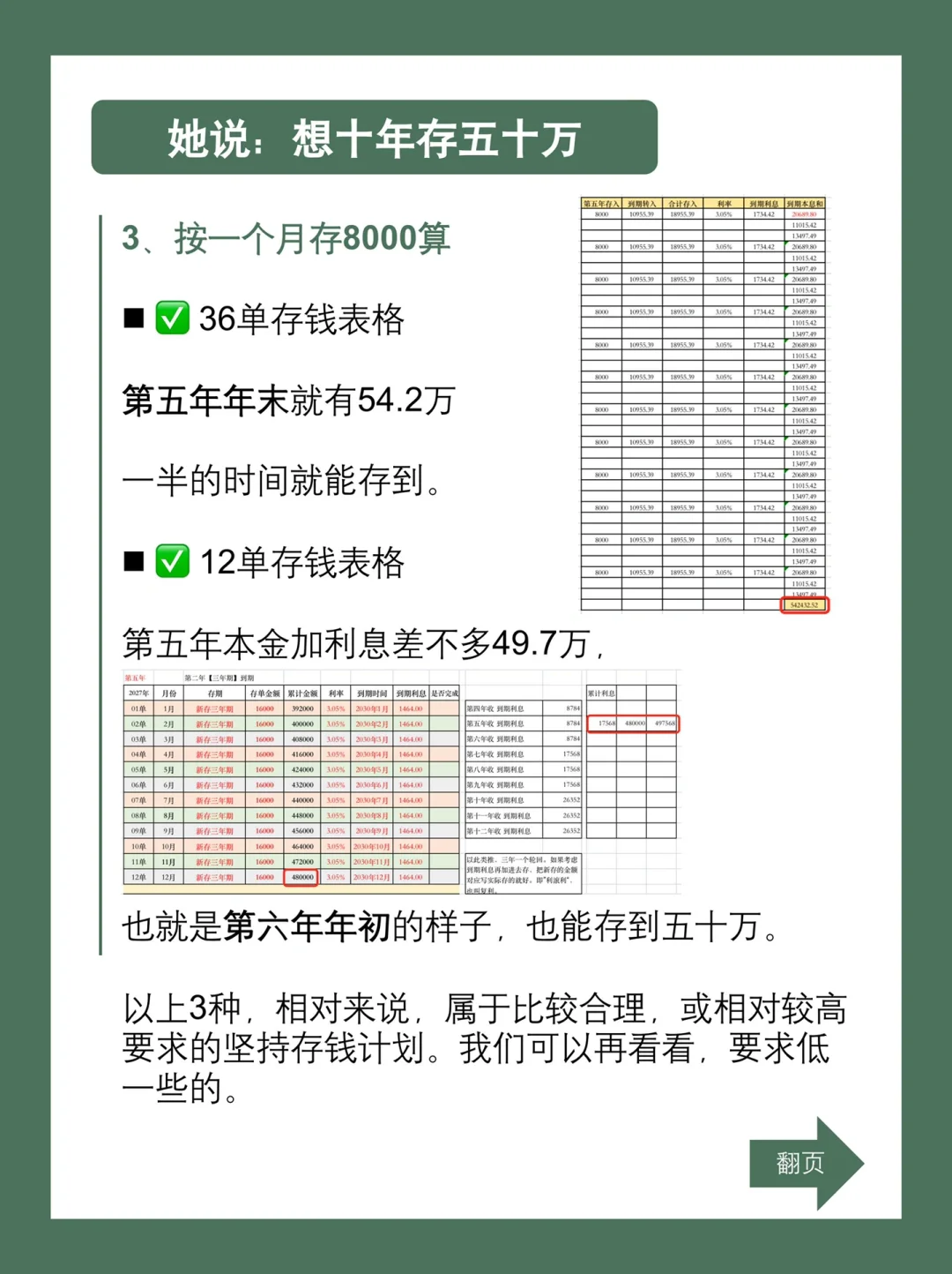 上面三个金额,相对来说,每个月存5000,会比较轻松一些。每个月存6000,需要努努力。每个月存8000,还是有点难度的。总体来说,按照这个姐妹的想法,十年存五十万,还是可以的,是可行的。