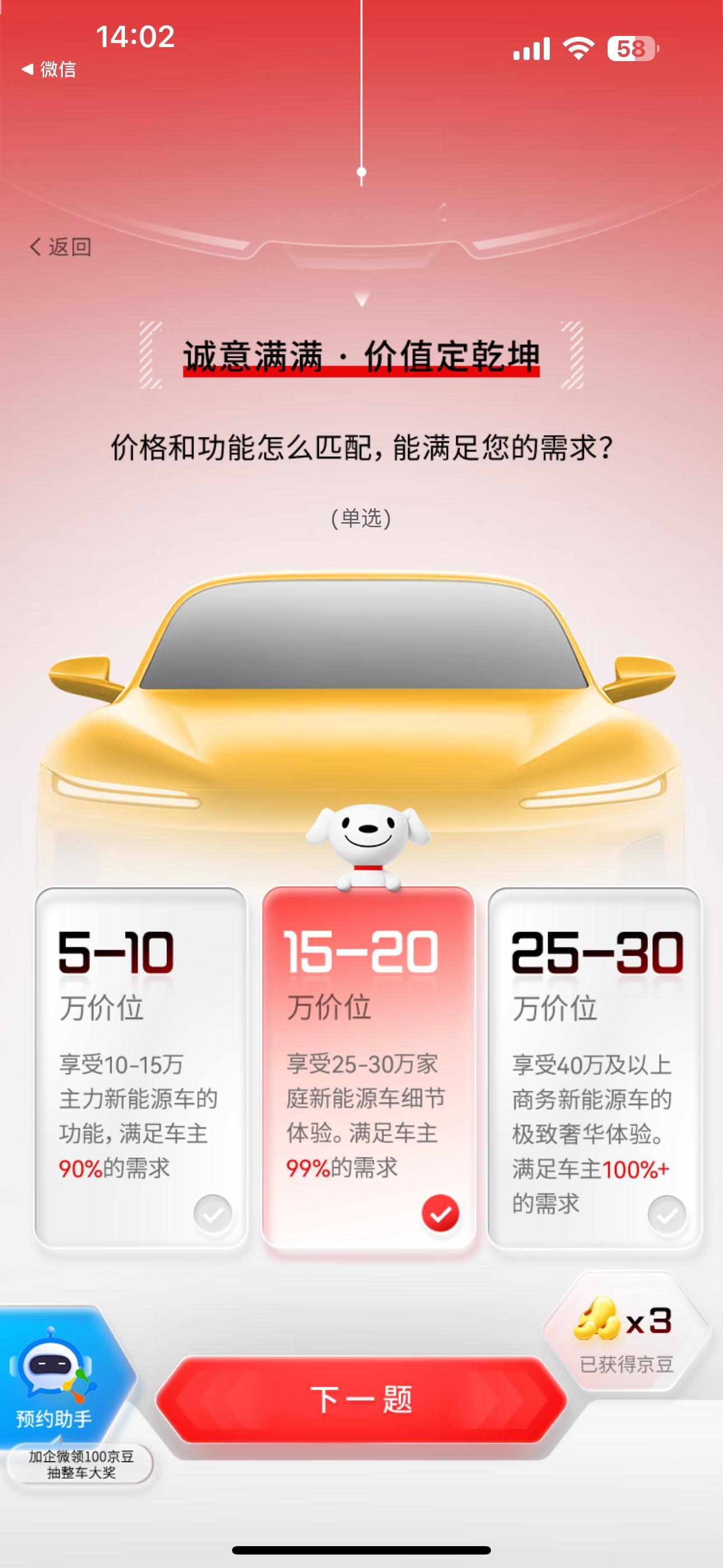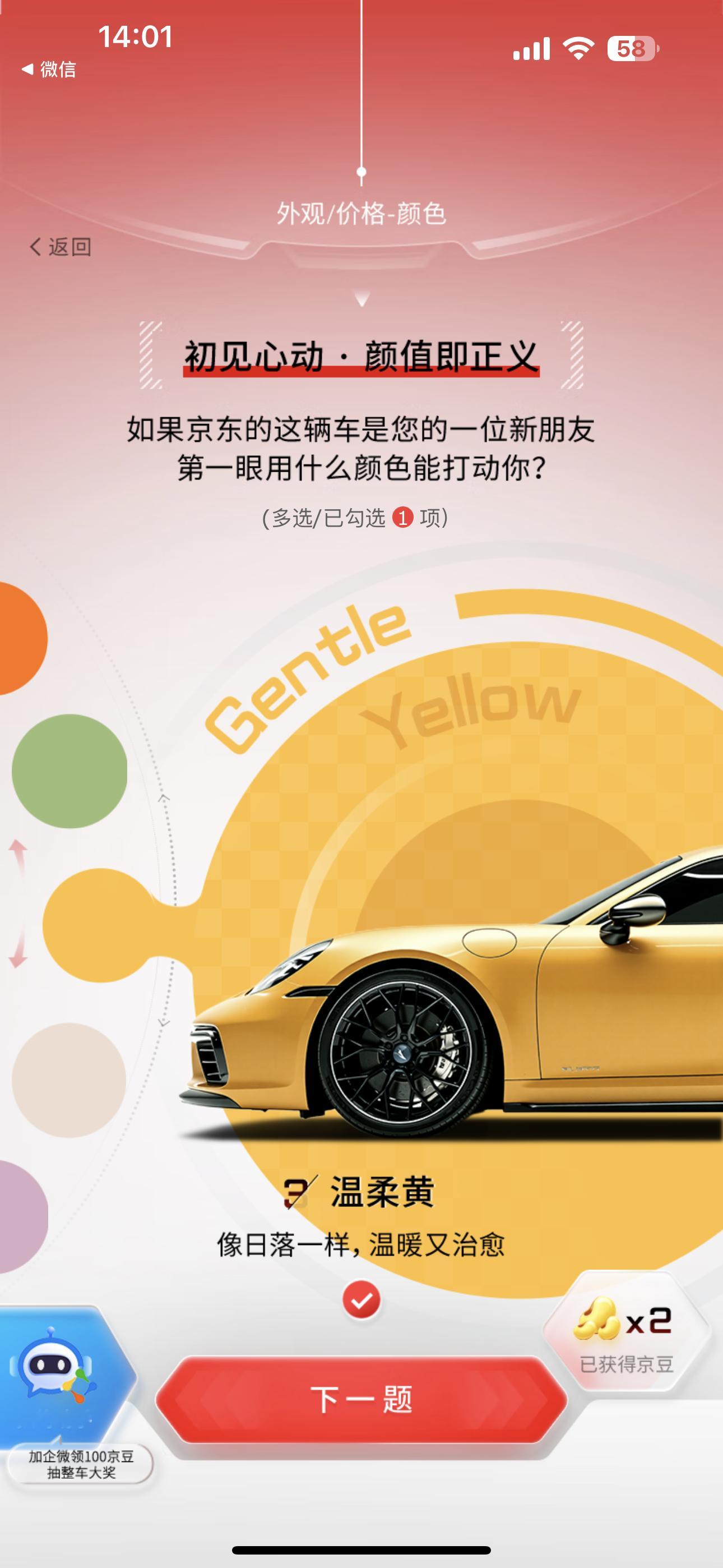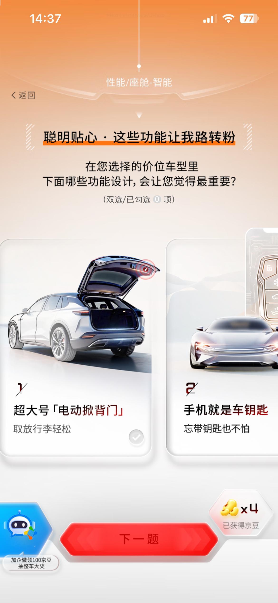 要我说,一台国民好车,绝不是简单的“代步工具”,而应是精准满足用户的核心痛点。外观上必须要有辨识度,采用年轻化的设计语言,比如贯穿式灯带、隐藏式门把手,打破平时廉价的刻板印象。空间是很多人在意的痛点,但也是机会点,通过短悬长轴的设计最大化轴距,优化后排腿部空间和后备箱实用性,这才是精髓。还有绝对不能妥协的安全问题,除了常规的主副驾气囊,侧气囊和侧气帘也应该成为标配,再加上L2级基础智能驾驶辅助,才能在复杂城市路况中给足安全感。基于此,我猜测京东这款车型可能会主打一个“越级”概念,价格大概率会卡在6-8万这个黄金区间,用B级车的配置思路去打造。我刚刚在H5里定制了我的Dream Car,选了神秘紫车身,还把电池续航和科技舒适度都拉满了!现在上京东搜索“国民好车”,参与“国民好车 由你定义”H5互动,10京豆先到手,推荐好友再送50,加企业微信还能再拿100,更有机会抽汽车大奖!戳【】快来聊聊你心中的国民好车该什么样?也去H5定制你的专属座驾吧,看看咱们的想法是不是一样!
