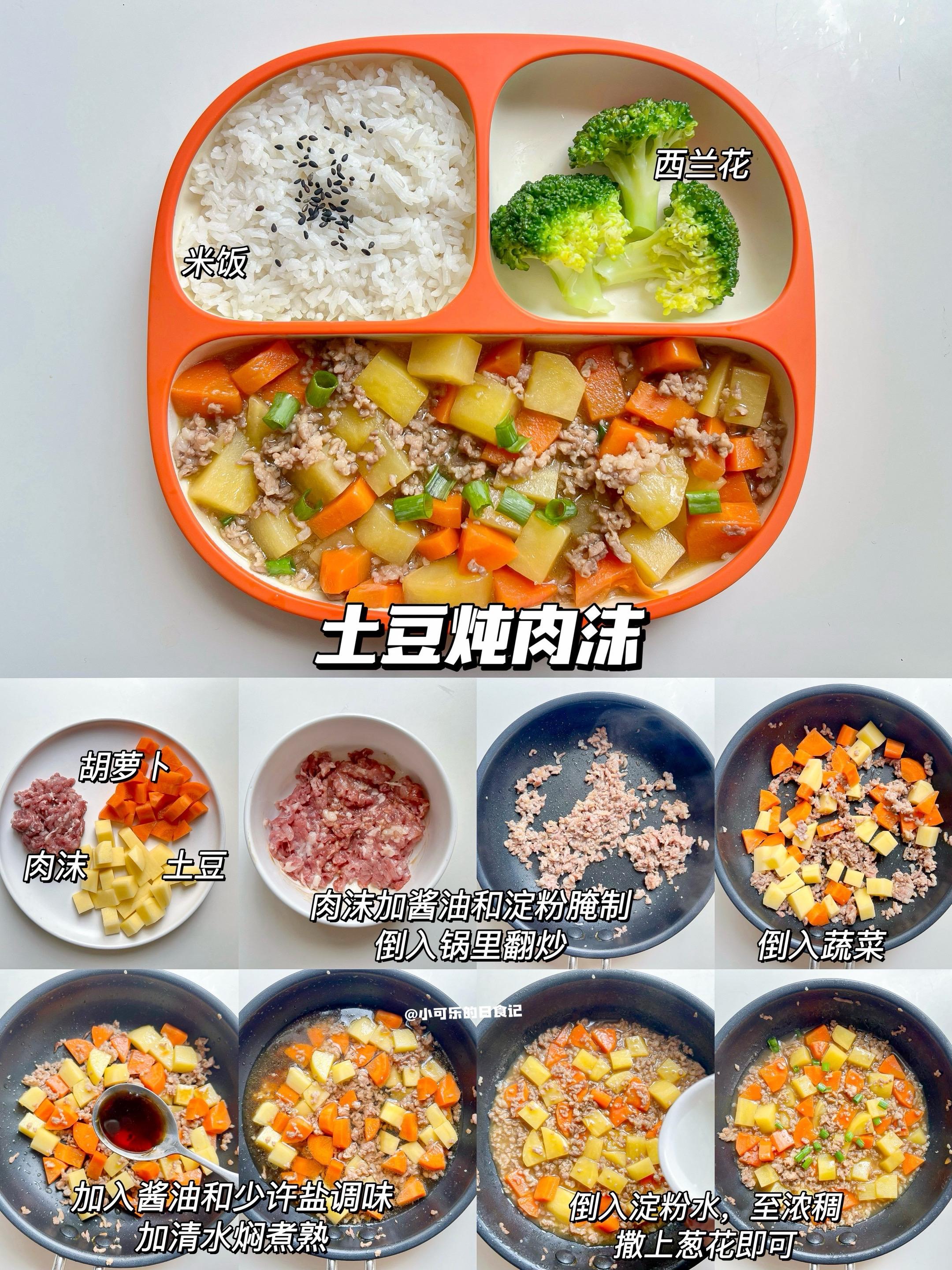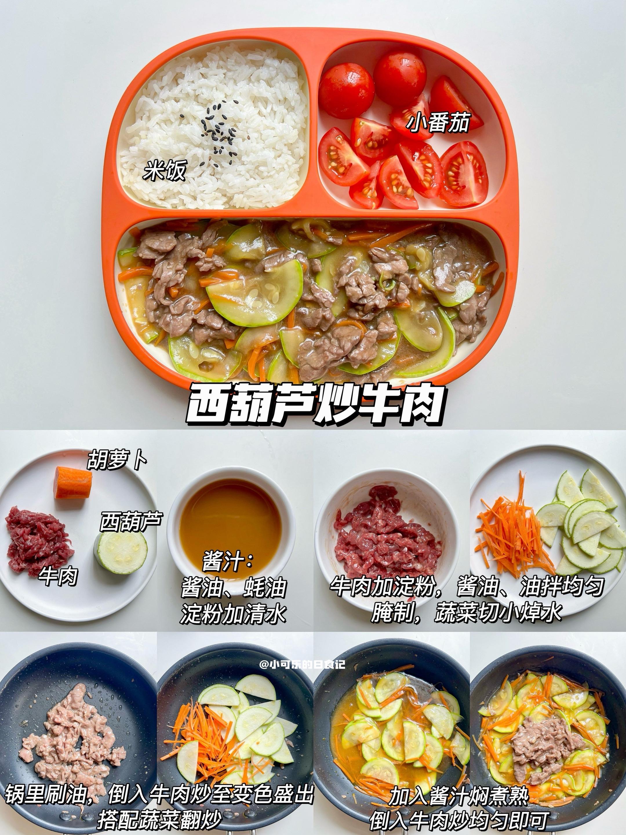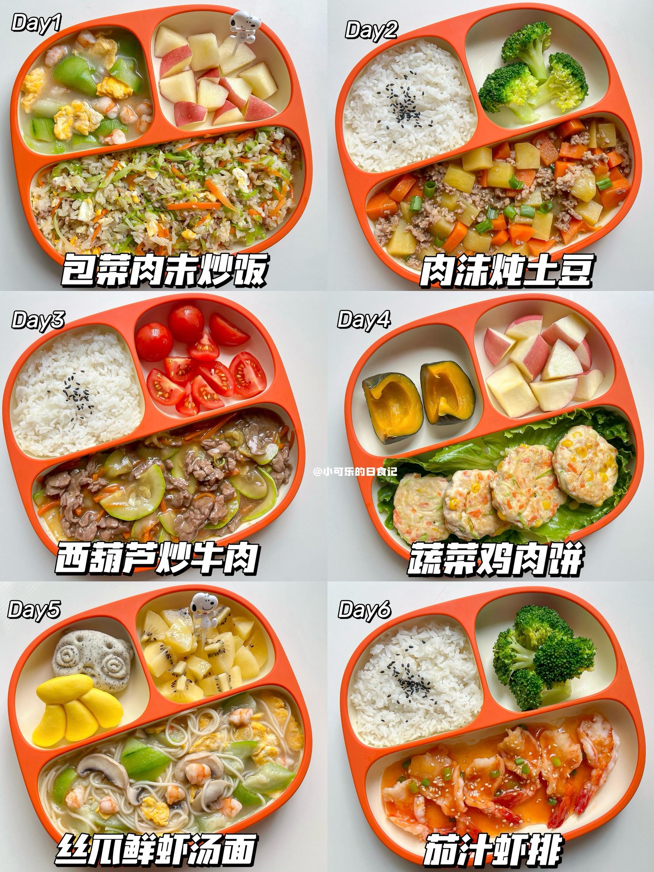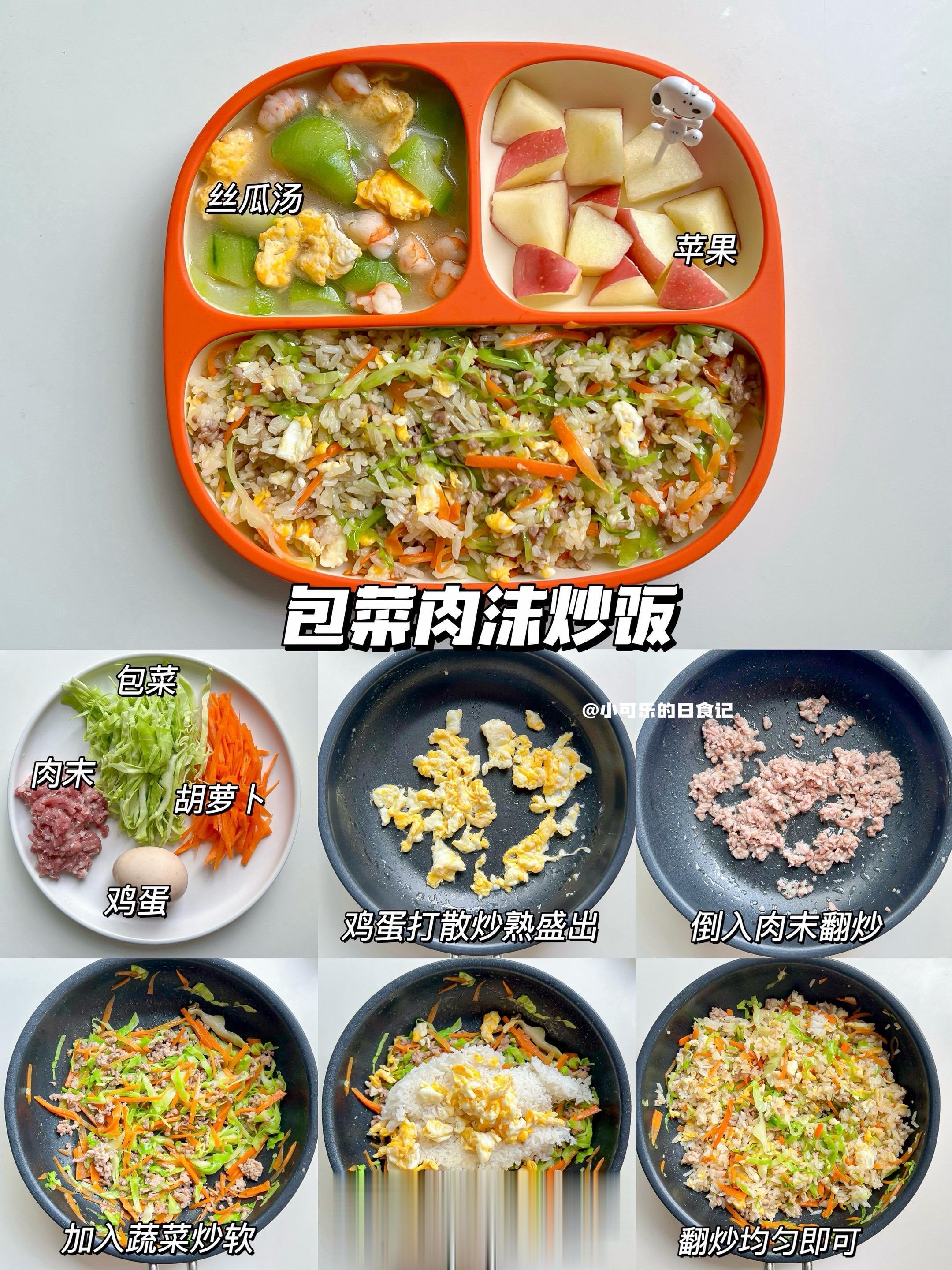 1岁+宝宝辅食|一周午晚餐不重样营养搭配。整理了可乐的一周的午晚饭,来给大家分享啦~ 面条/炒饭/快手等,荤素搭配,营养开胃又下饭,轻松搞定饭渣宝宝,妈妈们快来抄作业吧 🔸食材大小根据宝宝咀嚼能力处理 🔸肉类可换宝宝喜欢的,一岁以下宝宝不放调味,一岁以上可加少量 🔸宝宝的饮食需要荤素搭配,营养均衡,不需要要求宝宝全部都要吃完,宝宝食量不同,食材量可根据宝宝食量来调整   Day1 包菜肉末蛋炒饭➕丝瓜汤➕苹果 Day2 肉末炖土豆➕米饭➕西兰花 Day3 西葫芦炒牛肉➕米饭➕小番茄 Day4 蔬菜鸡肉
