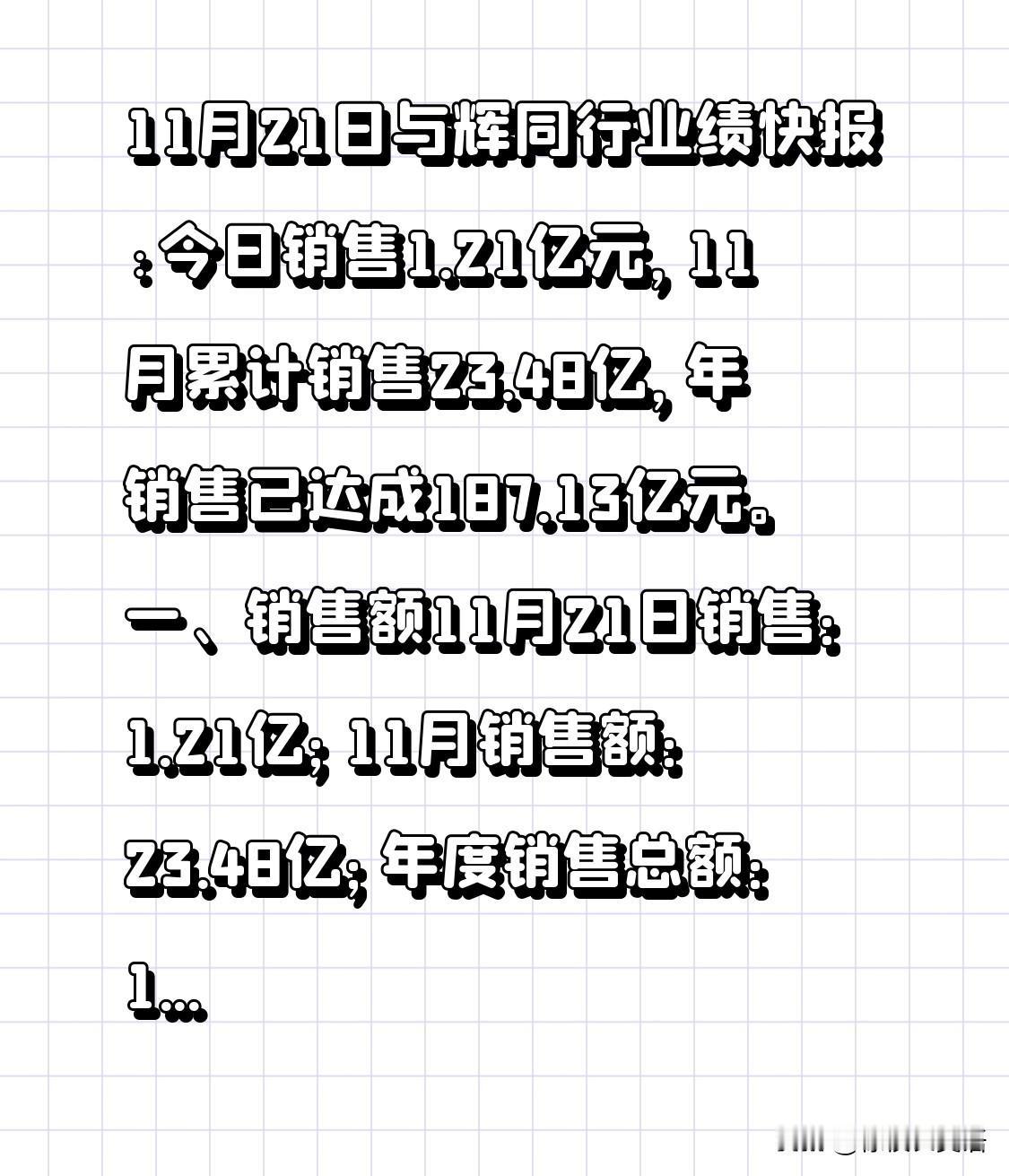 11月21日与辉同行业绩快报:今日销售1.21亿元,11月累计销售23.48亿,年销售已达成187.13亿元。 一、销售额 11月21日销售:1.21亿; 11月销售额:23.48亿; 年度销售总额:187.13亿。 二、粉丝数 11月21日涨粉:6.3万; 11月涨粉:119.5万; 圈粉总数:3490.7万; 粉丝碾压对方:690.4万。 2025年度销售已达187.13亿,距200亿仅有12.87亿只差。