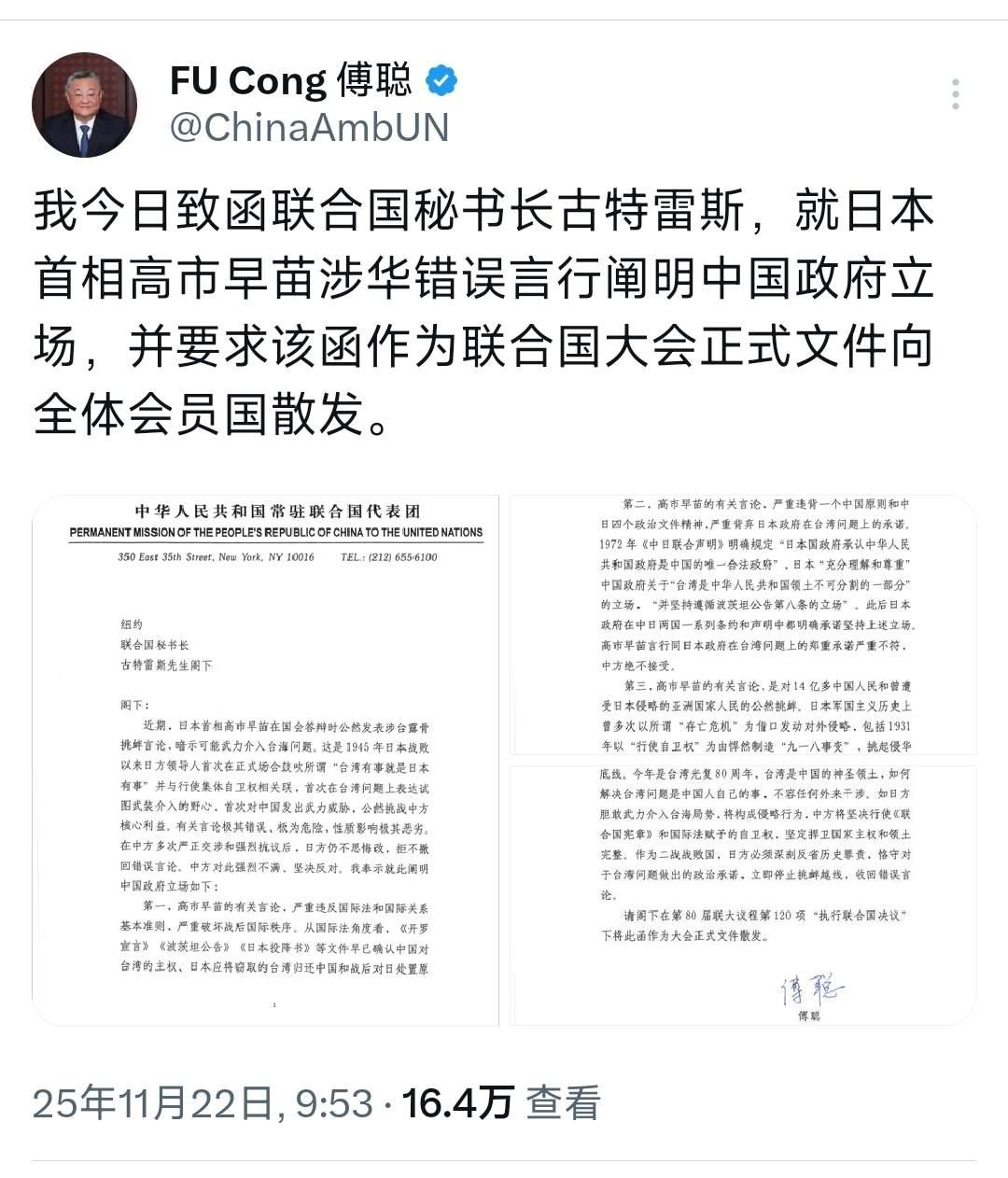 中国常驻联合国代表傅聪于11月21日致函联合国秘书长古特雷斯,就日本首相高市早苗涉台挑衅言论阐明严正立场,函件已作为联合国大会正式文件向全体会员国散发。 中国出兵讲究一个师出有名,中国此举就是在做这个动作。 高市早苗的疯狂挑衅,是1945年日本战败后,日方领导人首次在正式场合将“台湾有事就是日本有事”与集体自卫权关联,首次直白表达武装介入台海的野心并对中国发出武力威胁。尽管中方多次严正交涉抗议,日方仍拒不撤回错误言论,中方遂采取此次联合国层面的正式回应。 函件核心明确:台湾问题是中国内政,若日方胆敢武力介入台海局势,将构成侵略行为;中方将坚决行使《联合国宪章》和国际法赋予的自卫权,坚定捍卫国家主权与领土完整。 这一举措的高明之处在于,通过联合国平台昭告天下,既以法理夯实了反击日本的正当性,又占据道德与舆论高地。函件作为国际官方档案“立此存照”,让日方冒险行径在法理上无辩驳空间,为中方后续反制筑牢法律基础,也向全世界清晰传递出核心信息:任何势力插手台海绝非小事,而是对中国的侵略。
