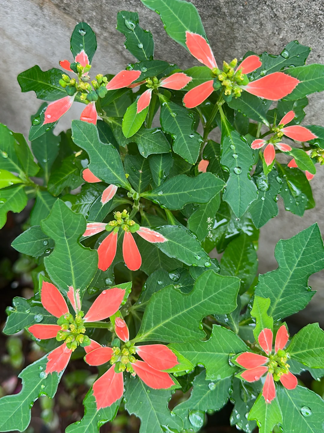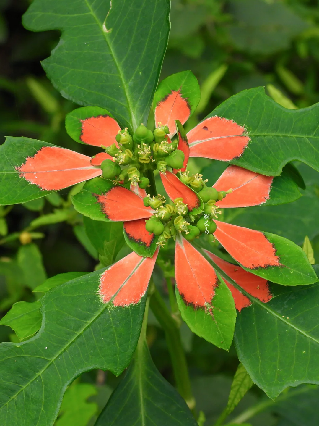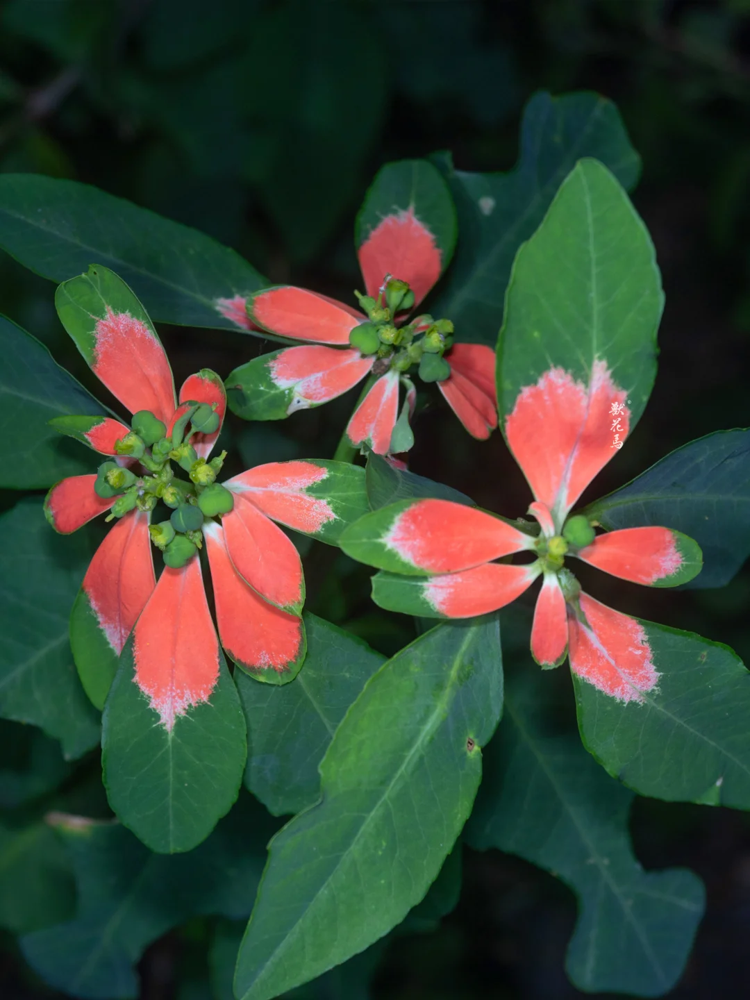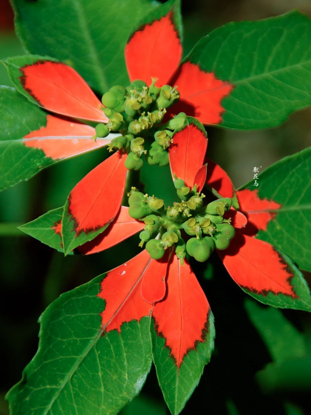 ✨叶片基部簇生鲜红色苞片,如绽放花瓣,中心点缀黄色小花