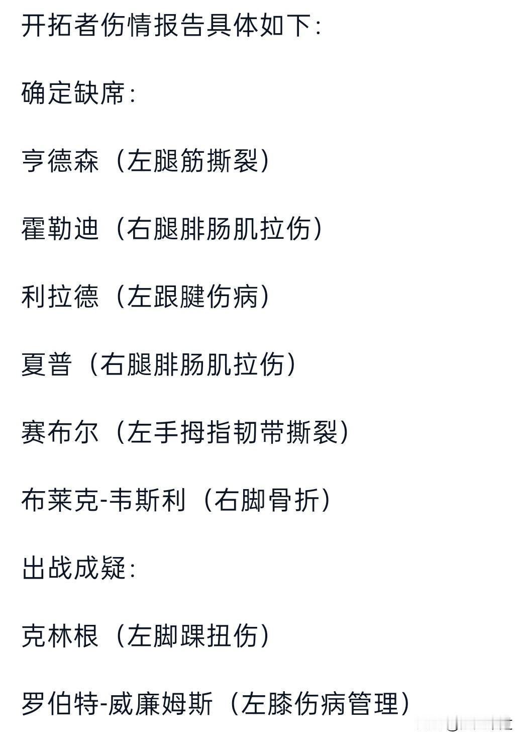 杨瀚森再迎绝佳机遇,有望首发出战雷霆!斯普利特为战胜勇士折损两名中锋! 开拓者果然跟广大球迷预想的一样,伤病满营!再不启用杨瀚森,斯普利特要亲自上场打球了! 克林根大家上场都看到了,扭的走路都不利索,左脚踝扭伤,下场必定会肿胀! 面对强大的联盟第一雷霆,勉强上场,真是没有必要! 开拓者最新伤情报告:克林根出战成疑, 罗伯特威廉姆斯,上场已经超队医给的限时令了!上场斯普利特为了赢球竟然让罗威上场了20多分钟,严重超出了队医给出的5-10分钟! 开拓者最新伤情报告:罗伯特威廉姆斯一样也出战成疑! 所以杨瀚森不用着急,赛季还很长,在开拓者这种球队,只要你不受伤,肯定会有出场机会!