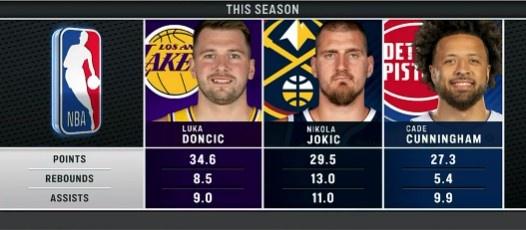 NBA新赛季最强三位球星:约基奇、东契奇、康宁汉姆!联盟450名球星中唯三场均砍下27分9助攻5个篮板的球员。NBA掘金 NBA球员排名 NBA球星榜 nba掘金 NBA 球星榜 掘金篮球