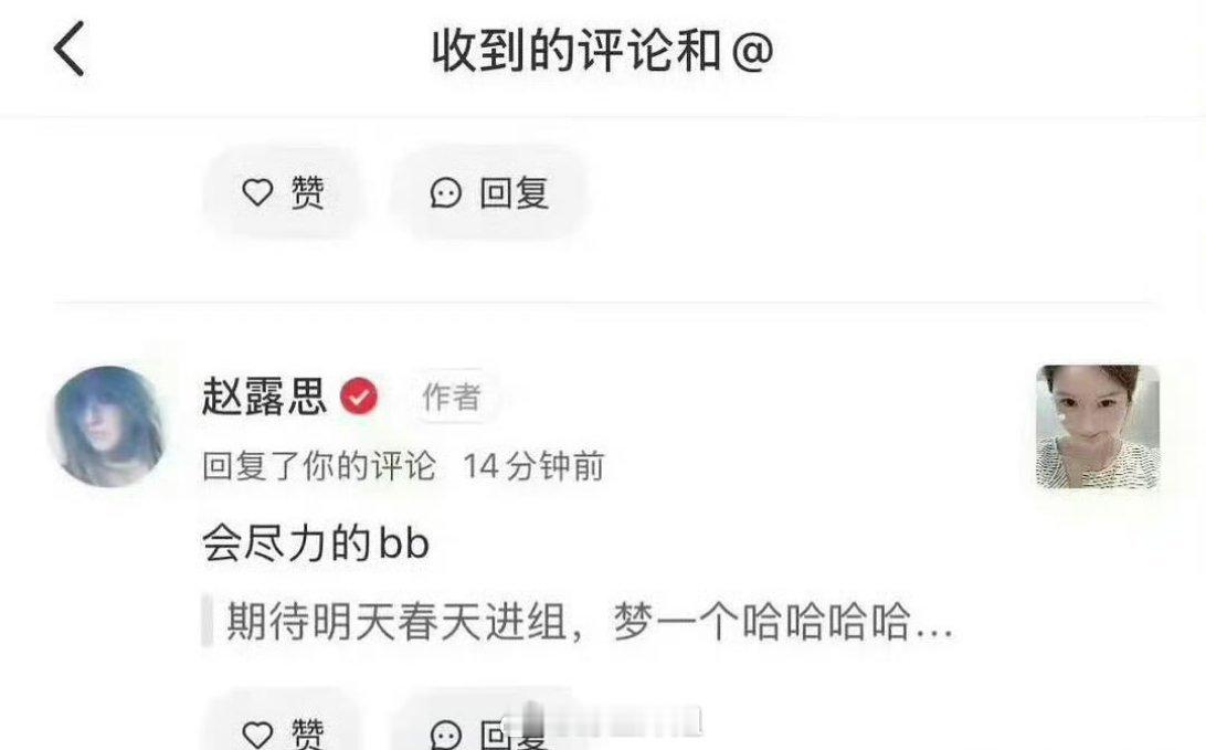 赵露思评论区粉丝留言“期待明年春天进组,梦一个”,赵露思直接回复说会尽力的bb,所以真的能够在新的一年看到赵露思进组呀,希望很大啊
