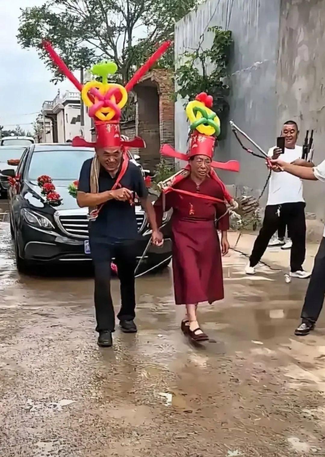 婚礼本来是大家高兴喜庆的事情, 喜公公喜婆婆被打扮成这样, 还不敢说不, 内心不好过,表面还要装作很高兴的样子, 一堆人拿着视频拍摄,感觉很好玩! 这样的陋习真该改改了。