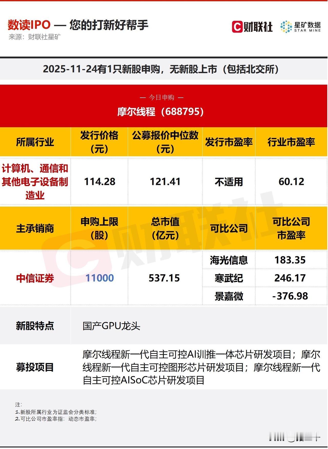 今日A股聚焦摩尔线程IPO, 发行价格114.28元行业市盈率60.12倍, 定价市值537.15亿元! 主承销券商是中信证券! 有新的股民也看出来了, *信承销的定价高发行当日涨幅最低! 因为摩尔线程是“-w”类型, 即科创板创新层主要看未来— GPU独角兽。 而且都是公募报价, 今年科技大牛市眼界和调性很高, 开盘当日凭借信仰还是有机会顶到千亿市值, 能中签就是幸运。