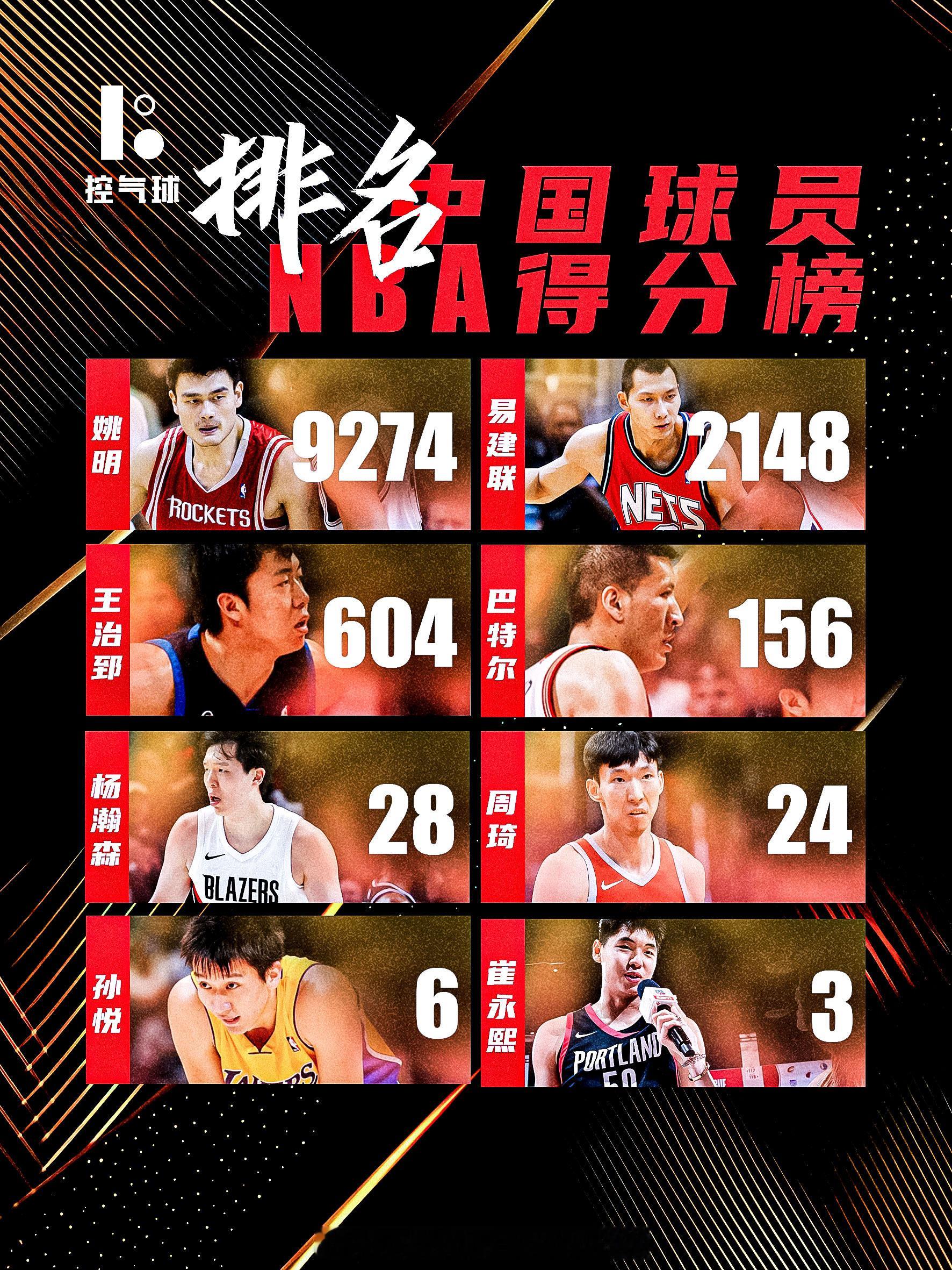 杨瀚森在今天的常规赛中拿到了8分,NBA生涯总得分已经超越周琦排在中国球员第五位,他下一个追赶的目标是巴特尔的156分