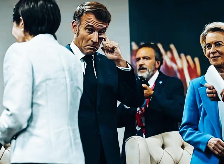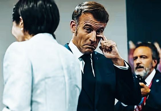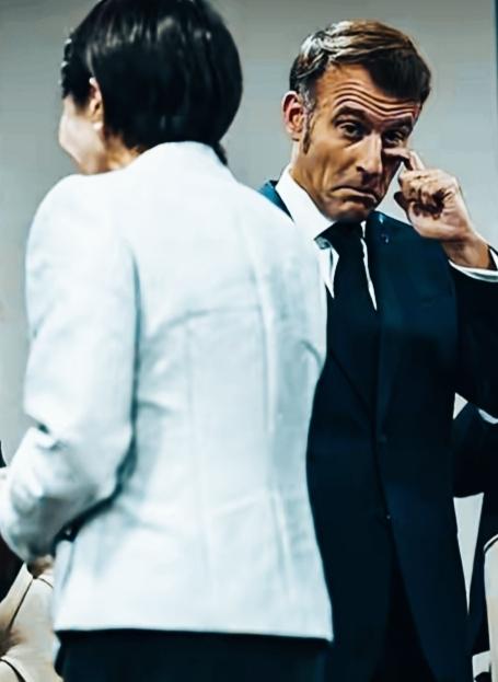 马克龙这姿势和表情挺有意思啊! 这表情是想传达什么意思呢? 这手在揉眼睛,是眼睛不舒服吗? 还是有其他隐晦的含义呢?