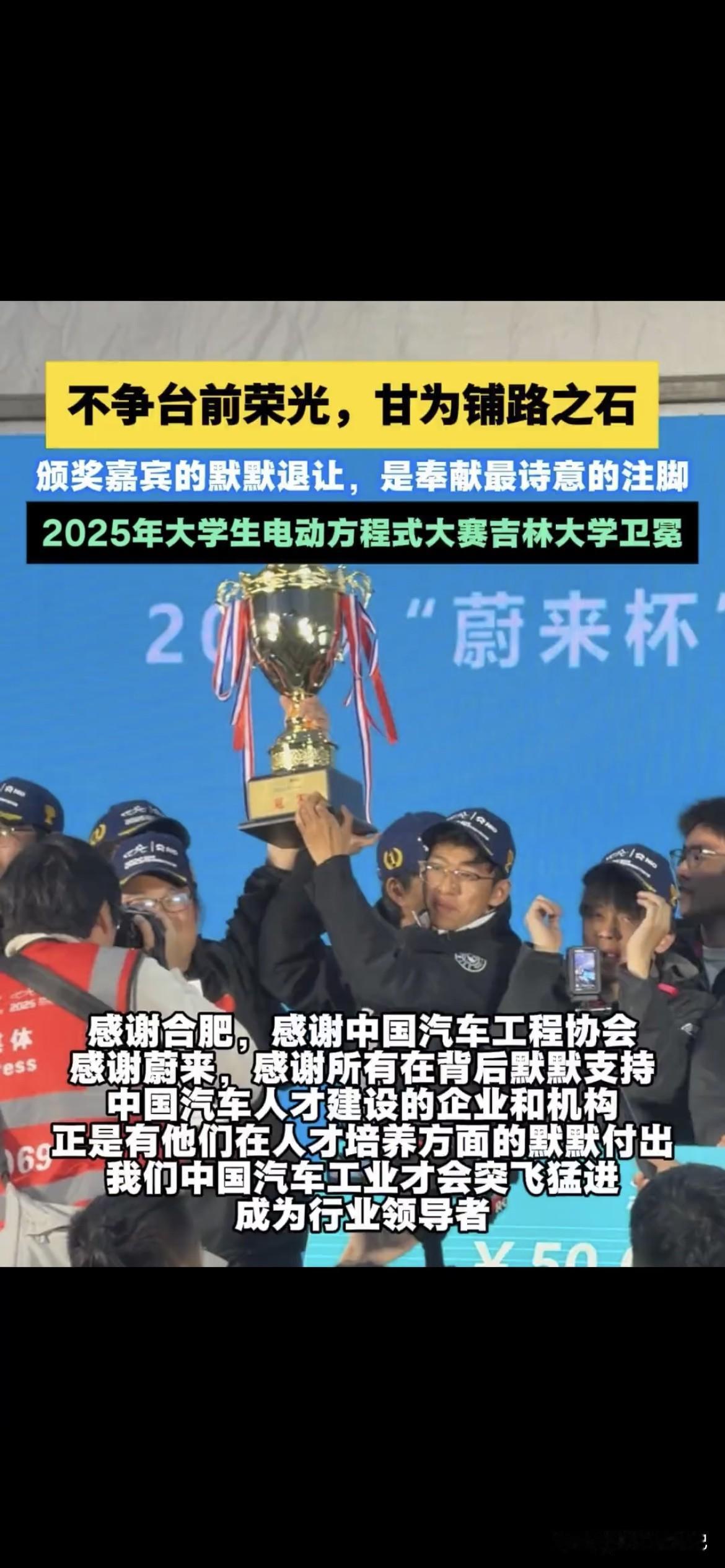 2025“蔚来杯”中国大学生电动方程式大赛太精彩了!11月23日在合肥骆岗公园落幕,吉林大学吉速电动方程式车队卫冕FSEC冠军。这次大赛超有排面,吸引了129支车队的5000余名师生,参赛数量是历届之最。 值得一提的是,蔚来李斌在蔚来最困难的时候都没放弃赞助这赛事,这份坚持太让人佩服。合影时他默默退出C位,低调又大气。这比赛鼓励学生动手创新,形成了八大方向人才培养体系,从静态赛到动态赛,全面考验学生能力。能看出这赛事对学生成长意义重大,也期待未来有更多精彩!