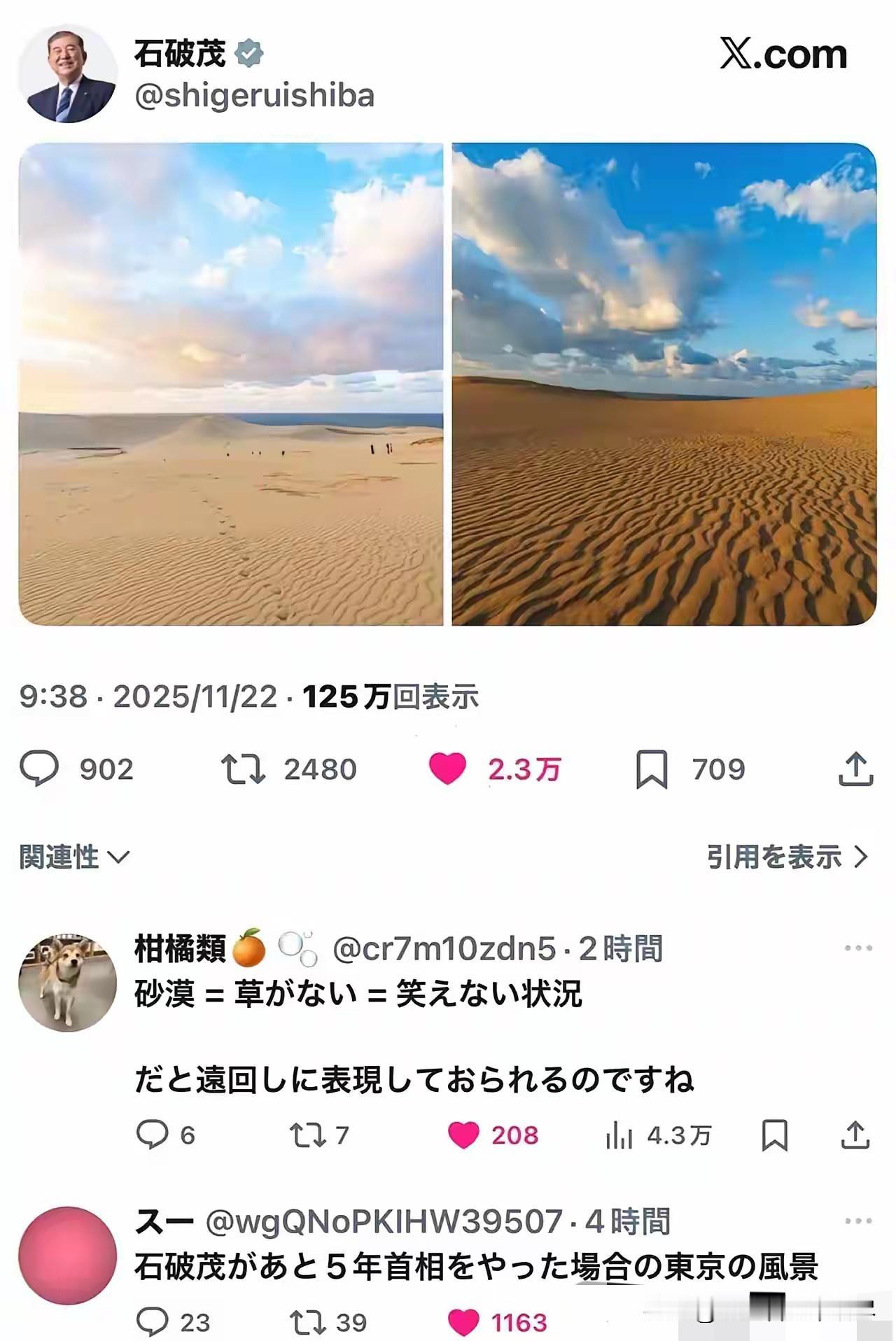 真是耐人寻味,日本前首相石破茂发的这两张照片,到底是想表达什么意思呢? 看石破茂发的这两张照片,里面都有沙漠,蓝天,白云,但是却并没有文字说明,实在让人搞不懂,他这到底是想表达什么意思呢?要知道日本可是个四面环海的岛国,是属于真正的沿海国家,实在搞不懂日本有什么地方,能跟沙漠扯上什么关系呢? 有谁知道石破茂发的,这两张关于沙漠照片,究竟是想表达什么意思呢?