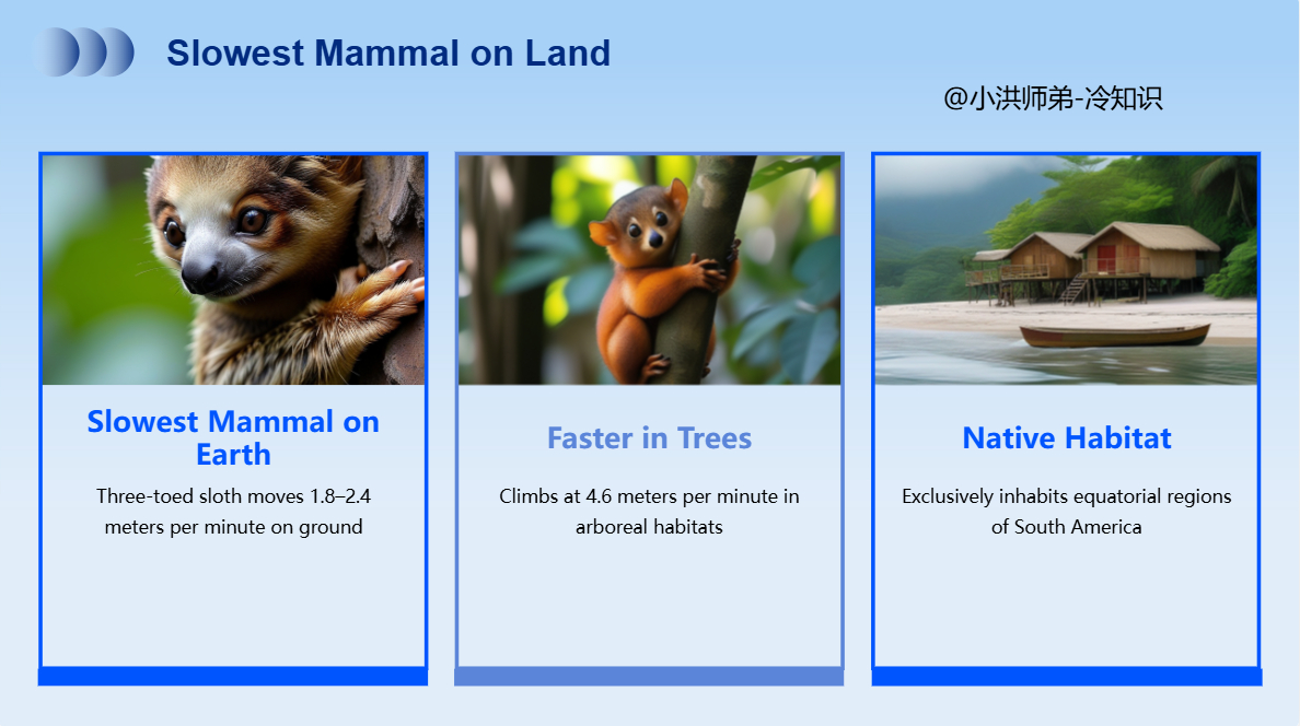 爬行最缓慢的哺乳动物三趾蝓是一种分布在南美洲赤道地带的哺乳动物。它在地面上爬行的速度为每分钟1.8~2.4米。在树上,它爬行得较快些,能达到每分钟4.6米,是世界上爬行最缓慢的哺乳动物。||
