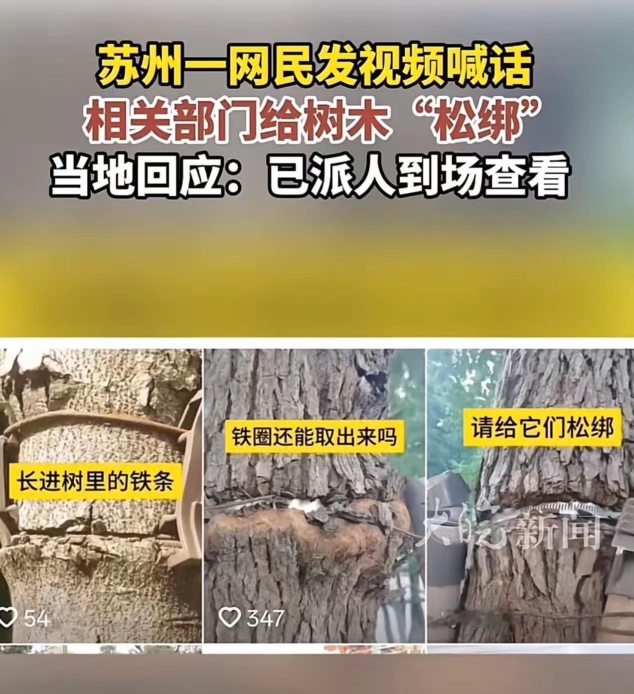 苏州,男子发视频喊话:“请相关部门过来看看,给树木松松绑,帮帮它们吧!”原来,苏