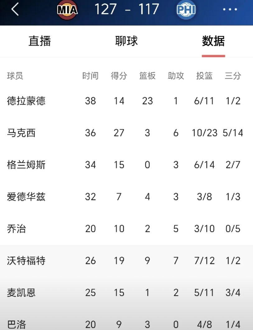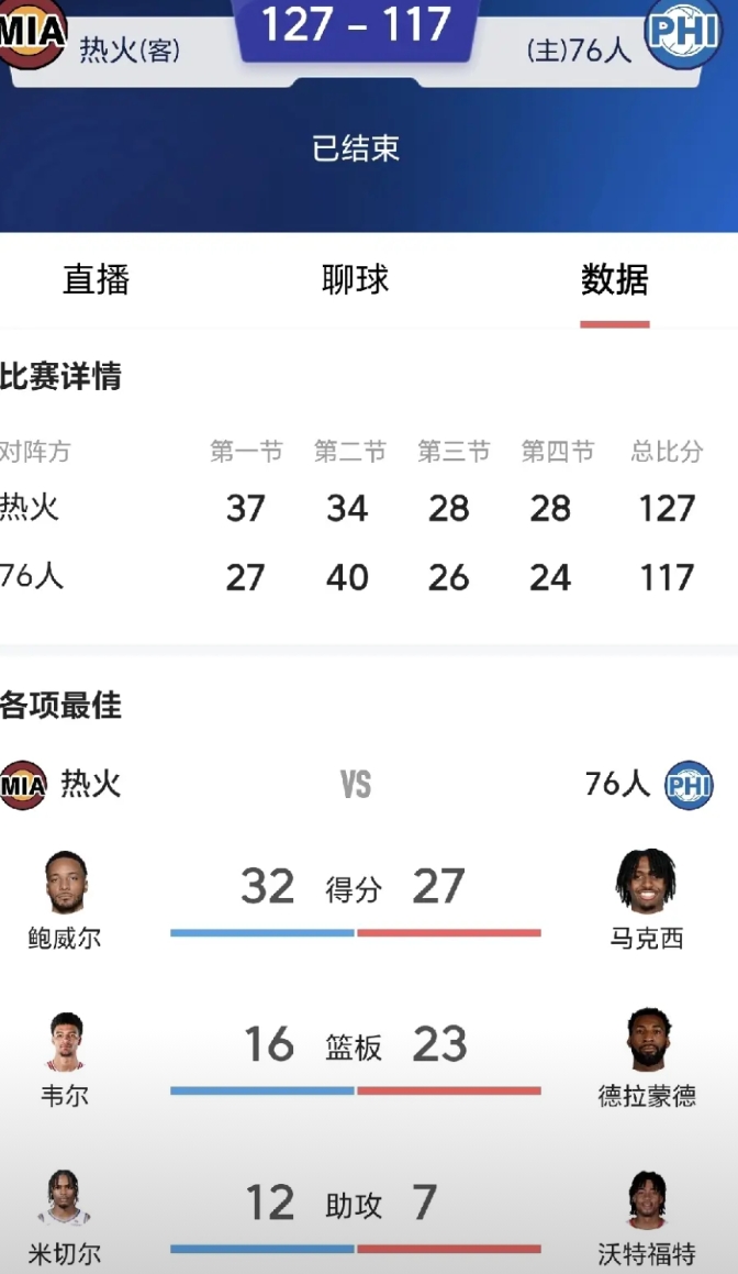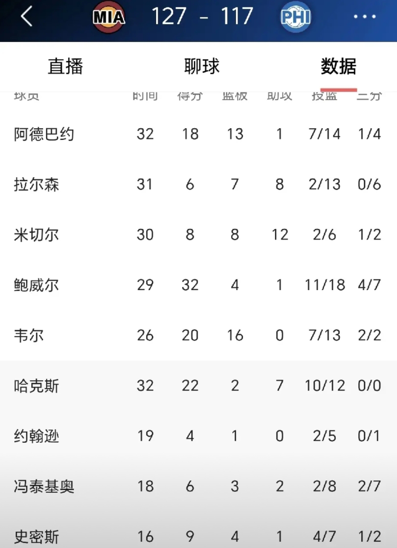 热火127:117大胜76人,希罗继续伤缺,威金斯轮休,就这样大胜76人,快船弃将鲍威尔18投11中,砍下全场最高分32分,再这么打下去,鲍威尔成当家球星了,快船今年是怎么想的,把抗产量的鲍威尔换成柯林斯+老头?