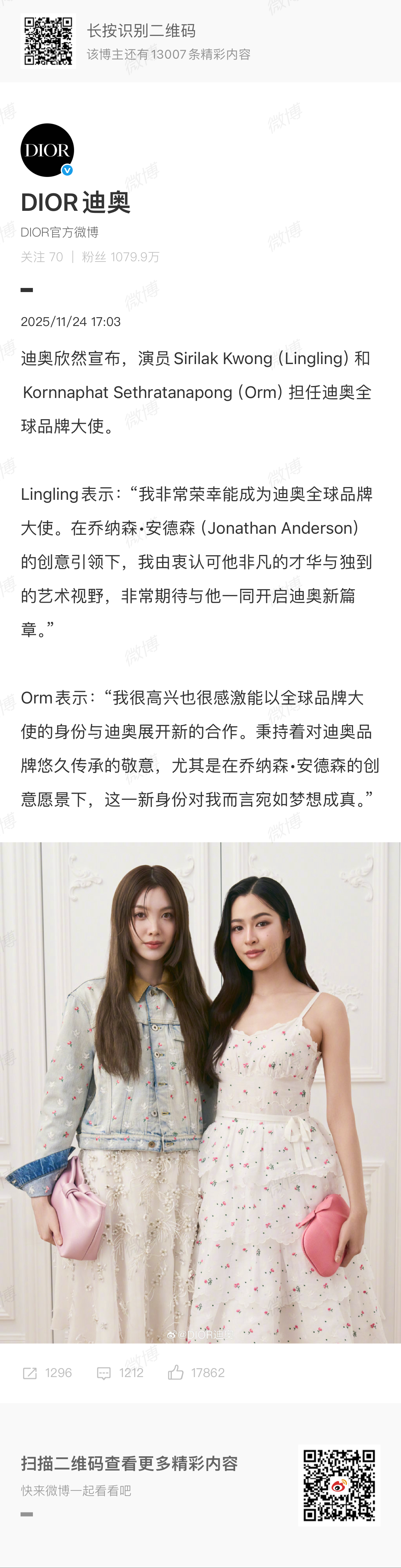 邝玲玲和Orm官宣迪奥全球品牌大使