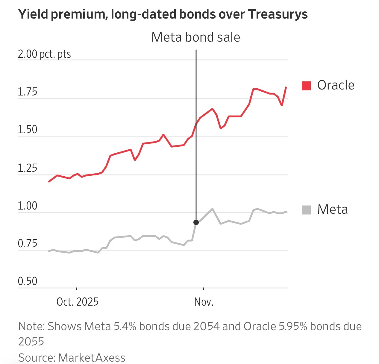 甲骨文正处于困境之中。公司目前已在大量消耗现金,并计划在未来几年继续投入数千亿美元,试图将自身从领先的软件公司转型为人工智能云计算巨头,通过出租用于运行像OpenAI的ChatGPT这类应用所需的大规模先进芯片集群来实现这一目标。甲骨文的债券评级比投机级只高两个等级,目前债券收益率已高于几乎所有其他投资级科技同行。研究机构CreditSights的高级分析师乔丹·查尔芬表示,甲骨文在未来三年内可能还会发行大约650亿美元的债券。为海外华人提供有价值的信息与分析,更多内容和全文可在蓝天、电报、x查找causmoney,或直接谷歌搜索查尔芬指出,债务成本小幅上升对公司影响不大,因为利息支出相较于资本支出仍然很小。但甲骨文必须保持投资级评级,因为市场上可供低评级企业使用的融资规模,根本不足以满足公司的需求。最近几周,甲骨文信用违约掉期的交易有所增加,这类工具曾在2008-2009年金融危机期间受到关注。尽管债券投资者普遍认为这类交易并不意外,但市场对此的关注仍对甲骨文股价造成压力,导致本月股价下跌了24%。(WSJ)