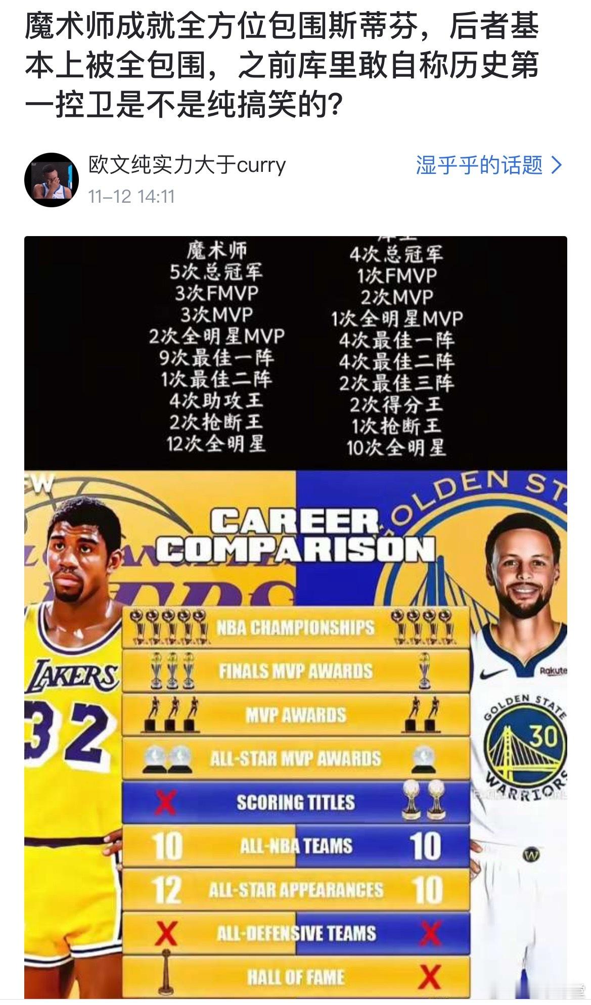 球迷讨论:魔术师成就全方位包围斯蒂芬,后者基本上被全包围,之前库里敢自称历史第一
