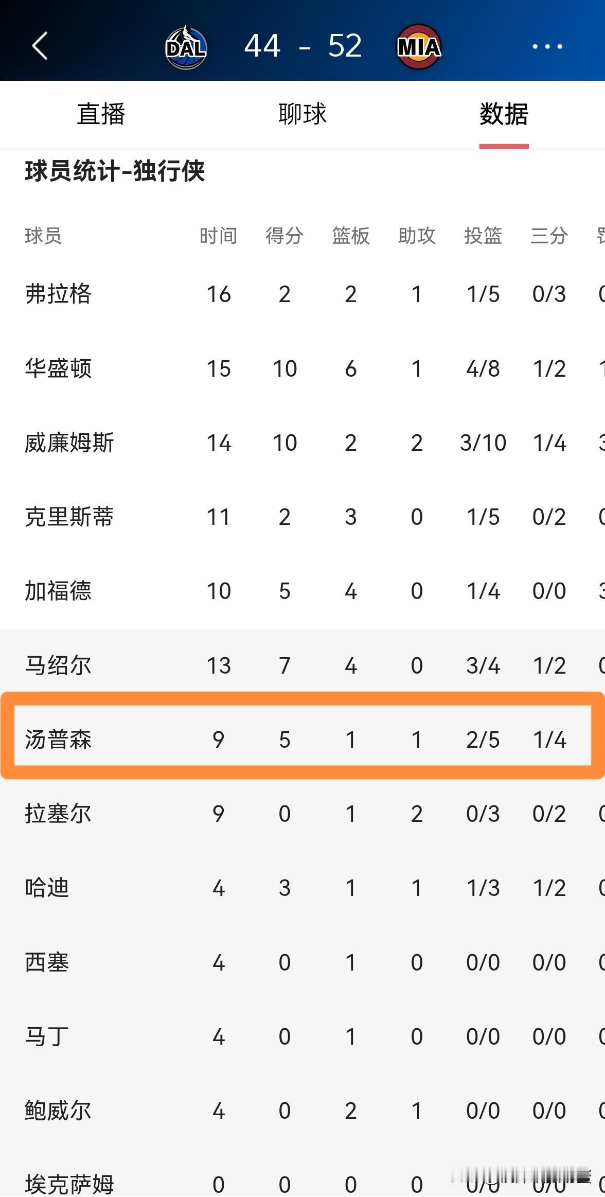 独行侠神射手汤普森终于变得正常了!在今天独行侠客场挑战热火的比赛中,目前双方半场战罢,独行侠以44:52落后于对手。在前两节比赛中,汤普森的表现比较正常,他在替补出战的9分钟里,投篮5中2,其中三分球4中1得到5分1篮板1助攻2抢断,他的场上正负值为+2。 作为一名老将,只要汤普森能够发挥正常,那就是对球队做出的大贡献了。