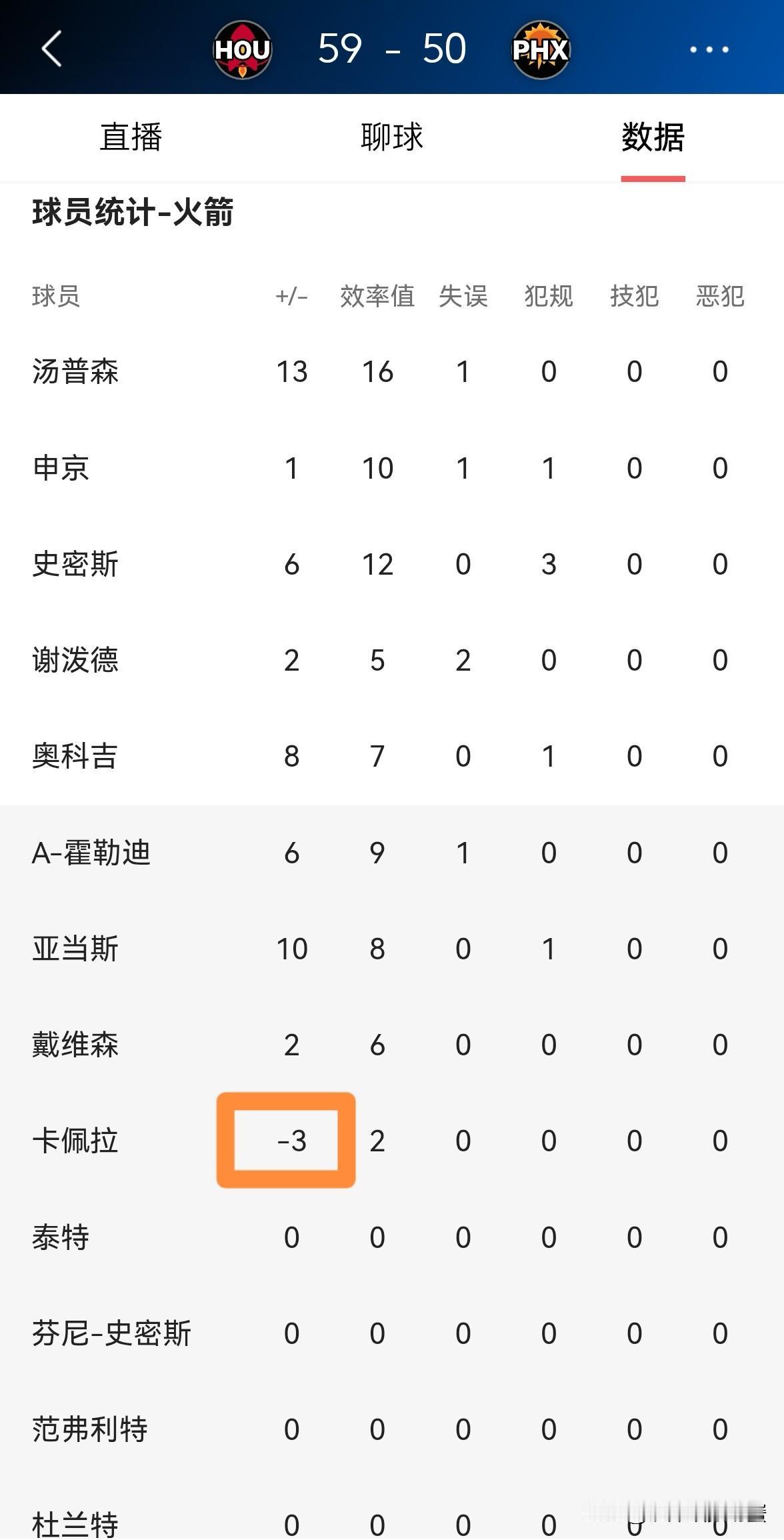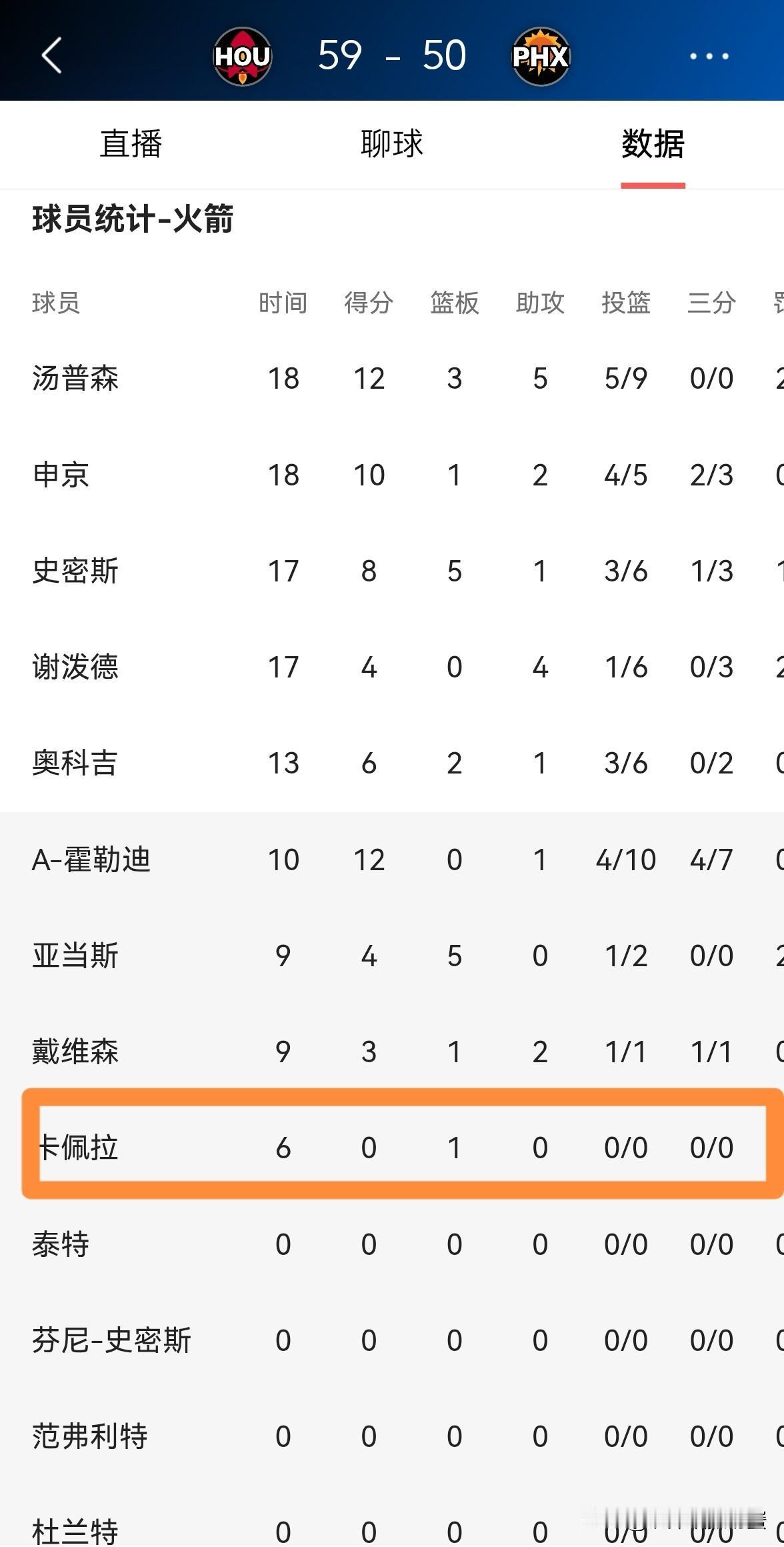 火箭老将卡佩拉太不会把握机会了!在今天火箭客场挑战太阳的上半场比赛中,卡佩拉在替补出战的6分钟里没有出手怒砍0分,不过有1个篮板1次抢断,此外卡佩拉的场上正负值为球队所有出场球员中最低的,他的场上正负值为-3,而且是唯一的负值。 坦白说,如果卡佩拉无法把握住这宝贵的上场机会,那么他很有可能会彻底的跌出球队的轮换阵容,因为火箭的几大替补悍将都在等待上场机会。