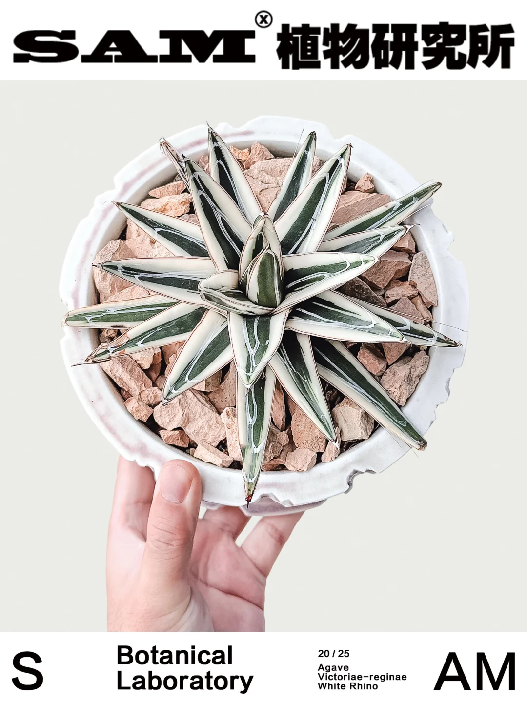 💚Tips:冰山为笹之雪龙舌兰的锦化变异,因其叶片乳白色的锦斑、厚实如象皮般的质感与冷峻气质而得名“冰山”。每片叶的边缘与叶脊浮现出乳白色的锦化线条,像雪线覆盖在山峰脊背上。每颗植株不同的锦化占比造就了不同的视觉效果,有的通体雪白,有的绿中带霜,每一株都是自然的独一无二艺术品,这也是它让人着迷的地方。叶端的黑色小刺如寒冰之冠,锋利而不失优雅。而且它们的叶片排列非常规整,有一种治愈系的美。冰山龙舌兰由于叶片是有锦化部分的,叶绿色会更少,因此其生长速度也是非常缓慢的,通常十年左右的生长期也仅能长成一个冠幅15cm左右的中等大小,是龙舌兰里面生长最慢的品种之一。作为“龙舌兰界的白金版”,它不是艳丽,而是冷峻的如“冰山美人”一般的极简几何之美。